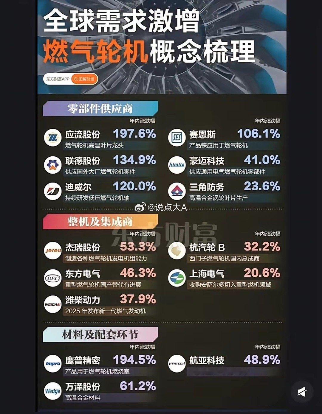 67、全球需求剧增,燃气轮机概念梳理。龙头集中在整机制造、控制系统、核心部件、配套辅机四大环节,以下是各领域头部企业(截至2026年2月):中国燃气轮机 一、整机制造(重型/轻型燃机)● 东方电气(600875)重型燃机国产化绝对龙头,自主G50(50MW)F级燃机商用并出口,国内市占率超35%,覆盖15–200MW谱系。● 上海电气(601727)国内唯一具备设计-制造-运维全链条能力,F/H级批量生产,掺氢燃烧领先。● 航发动力(600893)太行系列(110MW)军民两用,中小型/舰船燃机优势显著,核心部件配套能力强。● 中国动力(600482)中小型燃机(5–50MW)龙头,CGT25系列全场景应用。二、控制系统(燃机“大脑”)● 航发控制(000738)国内唯一全谱系燃机控制平台,军用市占率100%,民用/工业超70%,太行110唯一控制供应商。三、核心热端部件/材料● 应流股份(603308)高温叶片龙头,供应国内外主流燃机。● 钢研高纳(300034)高温合金龙头,单晶/定向合金,国产替代率超60%。● 万泽股份(000534)民营高温合金/叶片全流程供应商。四、配套辅机/结构件● 陕鼓动力(601369)燃机辅机龙头,通风/压缩设备市占率超30%。● 豪迈科技(002595)大型结构件(缸体/机匣)全球市占30%–40%,供应西门子/GE/三菱。