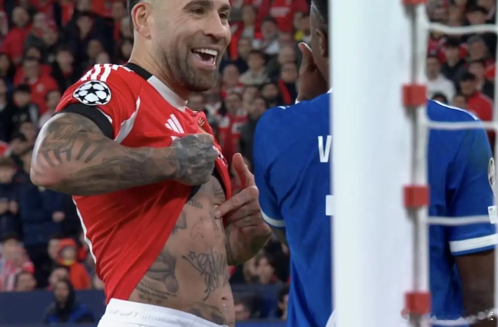 比赛的最后几分钟,在一次角球主罚时,双方又一次发生冲突,本菲卡队长奥塔门迪走到维尼修斯身边,掀起球衣向他展示了胸前的纹身--那是2022年卡塔尔世界杯上他随着阿根廷队赢得的大力神杯。