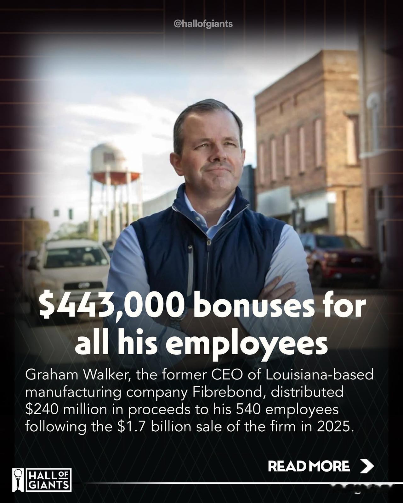 即将卸任的Fibrebond公司首席执行官格雷厄姆·沃克将公司出售所得的15%赠予其540名全职员工——每人44.3万美元,如果他们继续留在公司,这笔钱将在未来五年内分期支付。 Fibrebond Corp. 是一家位于路易斯安那州明登的家族式制造公司(专门生产模块化结构,如公用设施和数据中心的混凝土建筑)。 2025 年,沃克将 Fibrebond 出售给了伊顿(一家跨国电源管理公司),交易价值约为17 亿美元 (一些报道指出,交易基数约为 14 亿美元,经过调整后,包括员工部分,最终价值为 17 亿美元。 将出售款项的 15% 约合 2.4 亿美元作为公司 540 名全职员工的奖金作为出售的不可协商的条件,值得注意的是,这些员工并不拥有任何公司股票或股权;这笔奖金完全是沃克坚持的,以表彰他们在艰难时期以及自他担任首席执行官以来在他领导下的艰难岁月的忠诚。 关键细节: - 奖金平均约为每位员工 443,000 美元. - 奖金分五年支付,前提是员工在伊顿公司所有权期间继续留在公司(当前 )。这起到了重要的留住人才的作用。 根据工龄和其他因素,工龄较长的员工获得的薪酬明显高于平均水平。 - 分发工作于 2025 年 6 月/7 月开始,分发的是个性化信封——由于数量巨大,许多工人最初以为这是一个恶作剧或玩笑。 沃克将其描述为公平和信念的问题:“近2.5亿美元的资金掌握在员工手中,这感觉很公平,”他希望即使在几十年后也能听到有关其影响的故事。 此事被广泛报道,被视为慷慨领导的励志典范,包括《华尔街日报》(主要来源)、《财富》杂志、《纽约邮报》、《人物》杂志以及路易斯安那州多家地方媒体都进行了报道。它促进了明登小镇的当地经济发展,员工们利用这些资金偿还房贷、购买房屋/车辆、创业或资助子女教育等。 这是 2025 年末发生的一件真实且经过验证的事件。