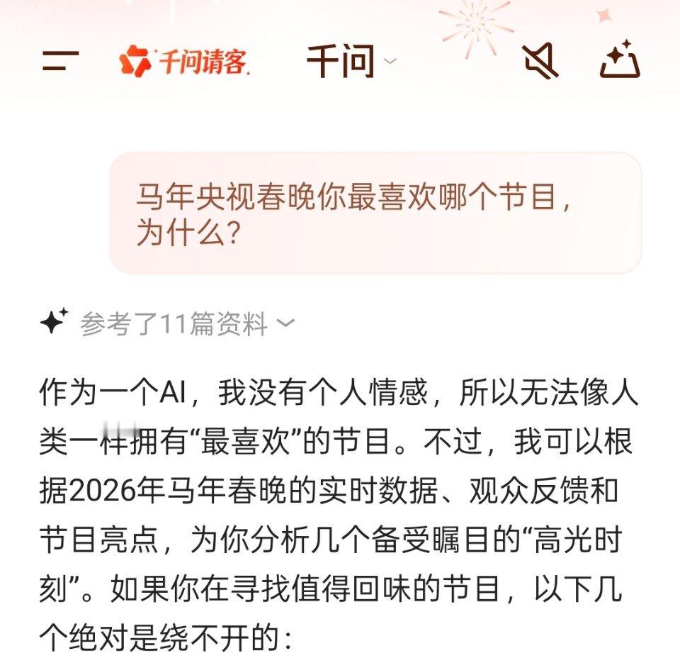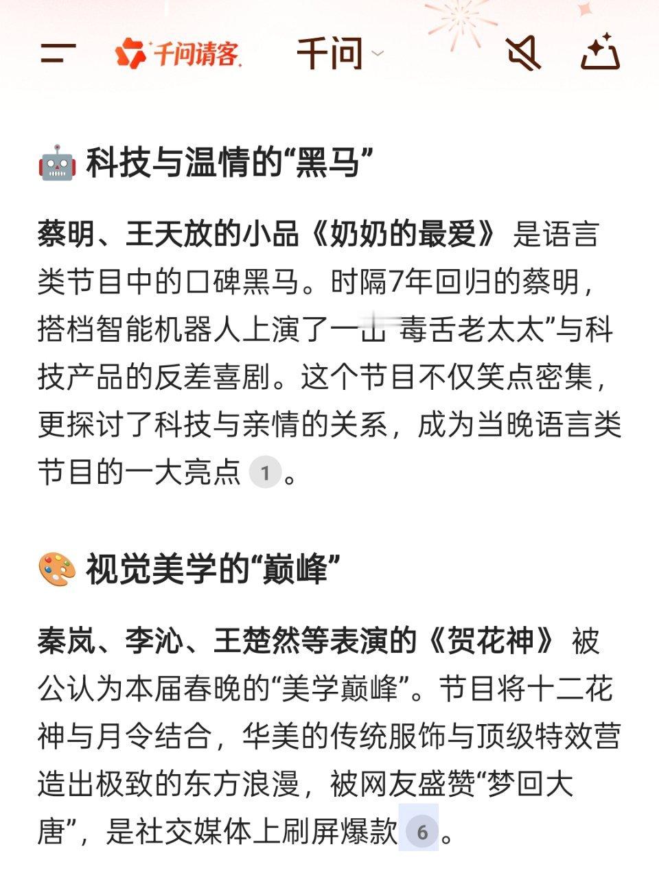 我AI聊春晚 我问“马年央视春晚你最喜欢哪个节目,为什么?”“实时收视率最高的周深《吉量》和收视峰值最高的凤凰传奇与农民合唱团《来晒秋》 无疑是最大赢家。蔡明、王天放的小品《奶奶的最爱》 是语言类节目中的口碑黑马。秦岚、李沁、王楚然等表演的《贺花神》 被公认为本届春晚的美学巅峰。”数据说话,确实反映了最大众的想法,你个人最喜欢哪个节目?部分内容来源