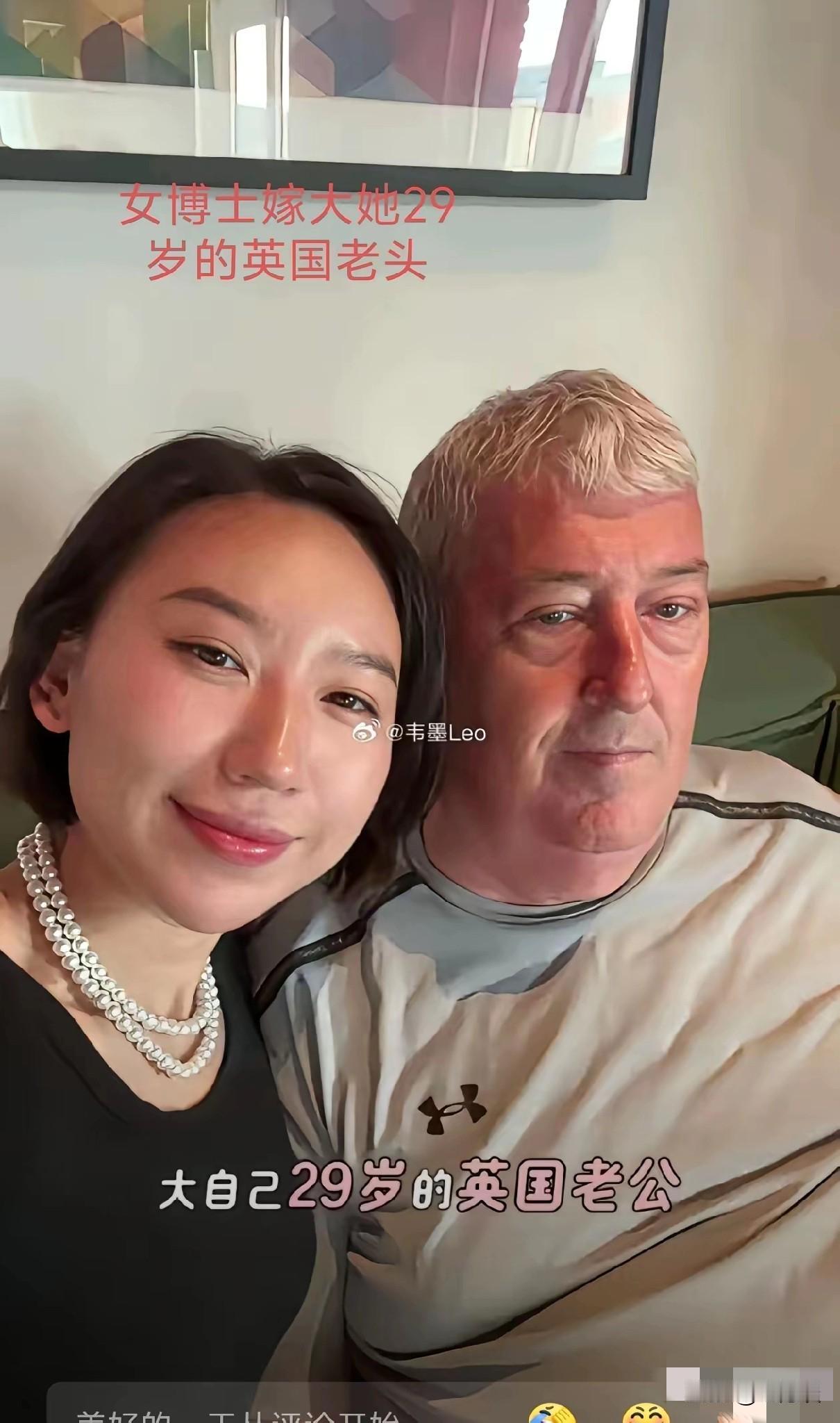 中国女博士嫁给了比自己大 29 岁的英国老先生,开通了视频分享两个人的没羞没耻的幸福生活,并且收获了好几万的粉丝。看来嫁给外国人确实是一门好生意。不过这么高的学历不去从事研究,天天分享两个人的幸福生活,读这么高的书的意义何在呢?难道就为了嫁给大自己 29 岁的外国人,实现自己的外国梦,否则实在想不通怎么会心甘情愿嫁给大这么多的外国人!