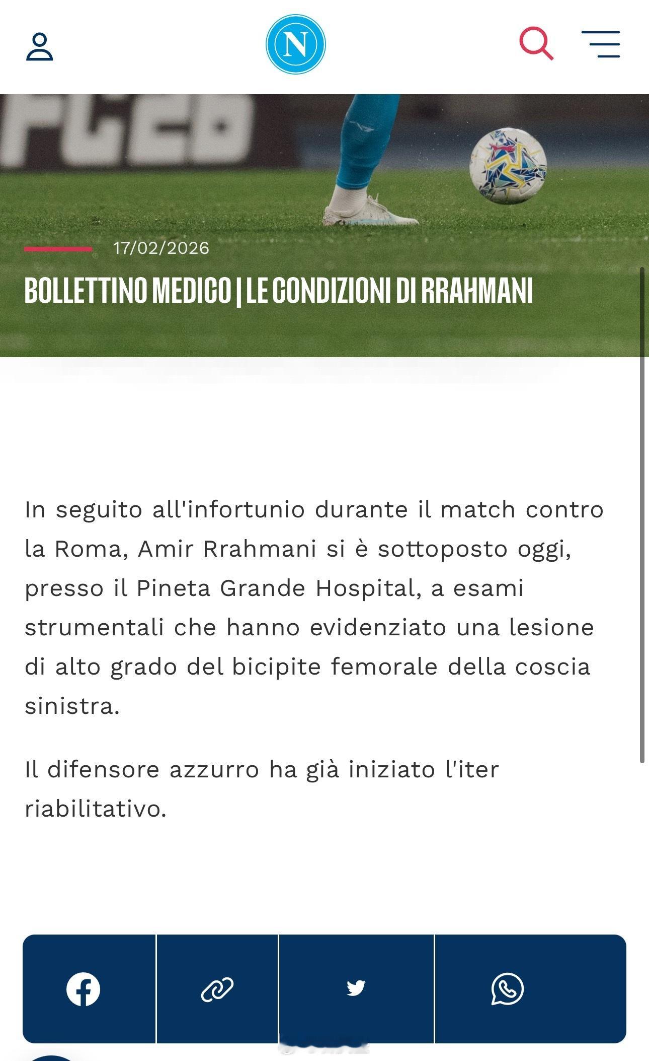 【拉赫玛尼重伤】在对阵罗马的比赛中受伤后,拉赫马尼今日在皮内塔格兰德医院接受了仪器检查,结果显示其左大腿股二头肌出现了高等级损伤。已经开始了康复流程。