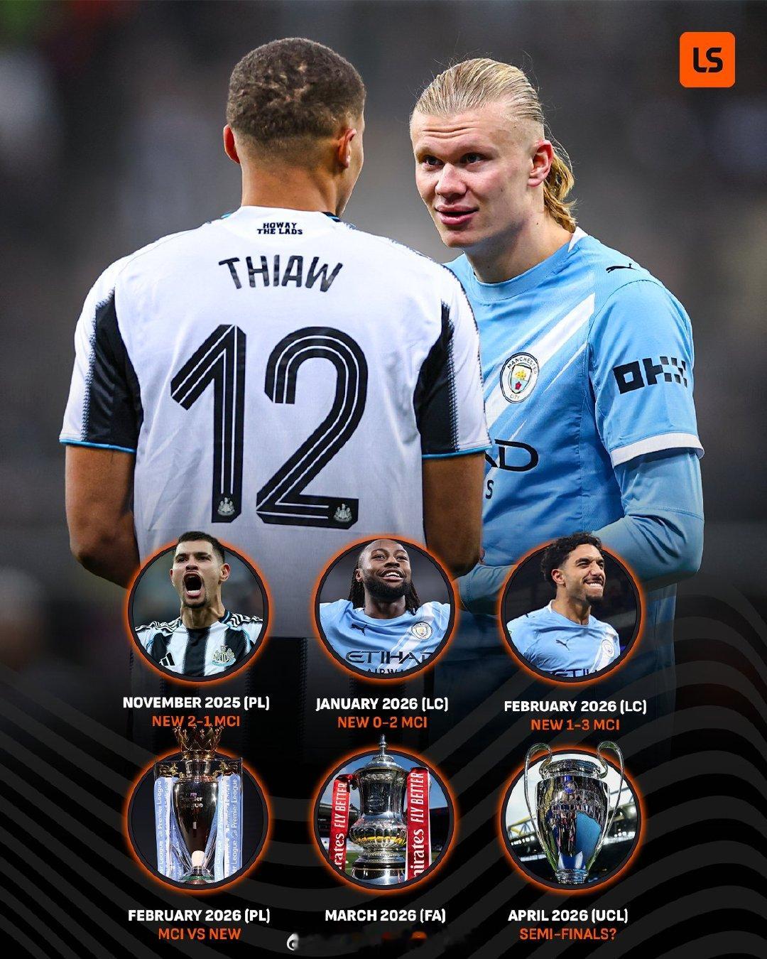 2025年11月,英超联赛,纽卡斯尔联2比1曼城2026年01月,联赛杯半决赛首回合,纽卡斯尔联0比2曼城2026年02月,联赛杯半决赛次回合,曼城3比1纽卡斯尔联2026年02月,英超联赛,曼城vs纽卡斯尔联2026年03月,足总杯第5轮,纽卡斯尔联vs曼城