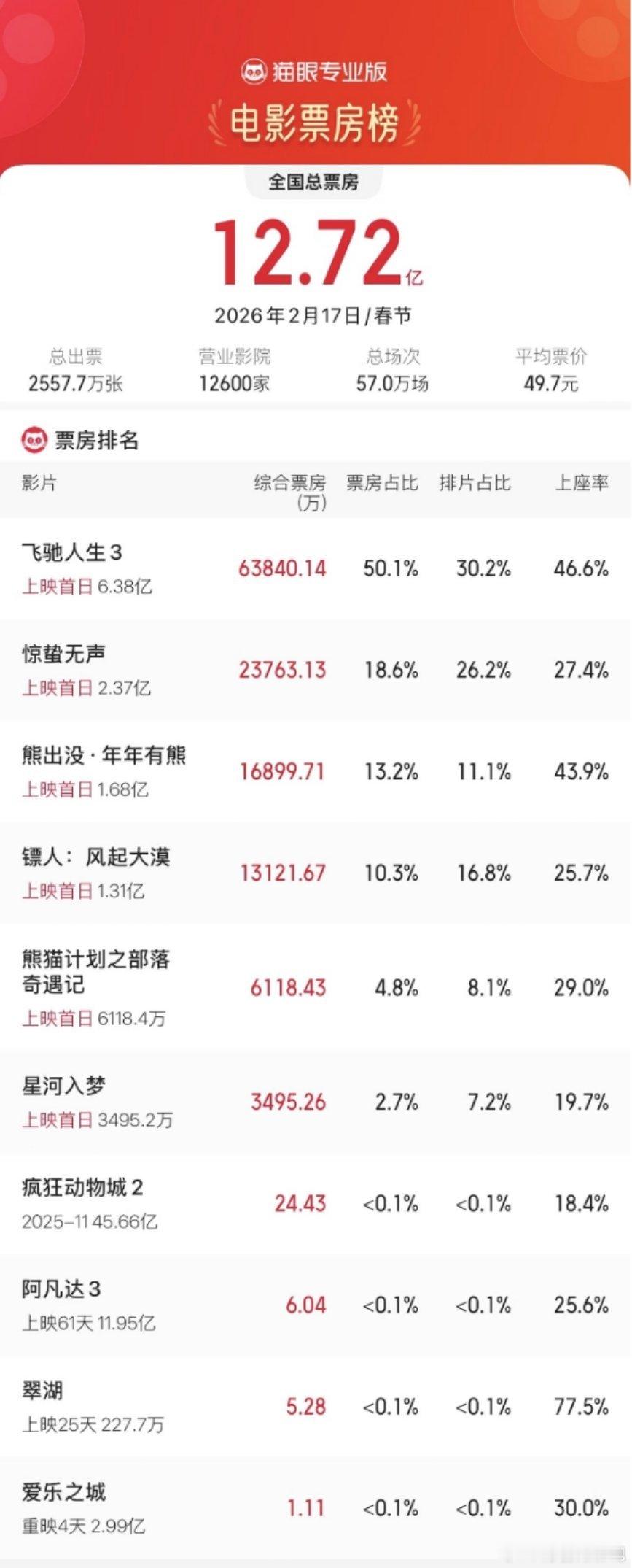 TOP1:沈腾《飞驰人生3》💰 63730.02万TOP2:易烊千玺、朱一龙《惊蛰无声》💰 23732.20万TOP3:《熊出没》 💰 16882.21万4️⃣吴京、谢霆锋《镖人:风起大漠》 💰 13099.79万5️⃣ 成龙、马丽,乔杉、于洋《熊猫计划之部落奇遇记》 💰 6109.35万6️⃣ 宋茜、王鹤棣《星河如梦》💰 3491.04万