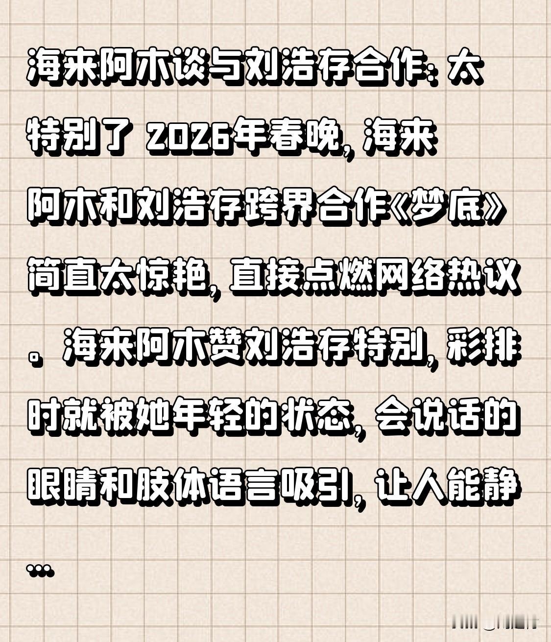 海来阿木谈与刘浩存合作:太特别了 海来阿木谈与刘浩存合作:太特别了 2026年春晚,海来阿木与刘浩存跨界合作《梦底》,表现惊艳,引发网络热议。海来阿木称赞刘浩存特别,彩排时,就被她年轻的状态、会说话的眼睛和肢体语言吸引,让人能静下心来投入唱歌。 此次合作的魅力在于艺术语言的极致碰撞。海来阿木用沙哑声线承载彝族音乐的生命力,刘浩存以空灵舞姿似“坠入凡尘的精灵”。“独唱 + 独舞”双线叙事,歌声与舞步刚柔对比,直击情感共鸣。《梦底》历经24版改编,这份打磨源于他们对跨界合作的敬畏。刘浩存回归舞蹈获认可,海来阿木凭草根经历让民族血脉在舞台奔涌,这样的合作值得点赞!