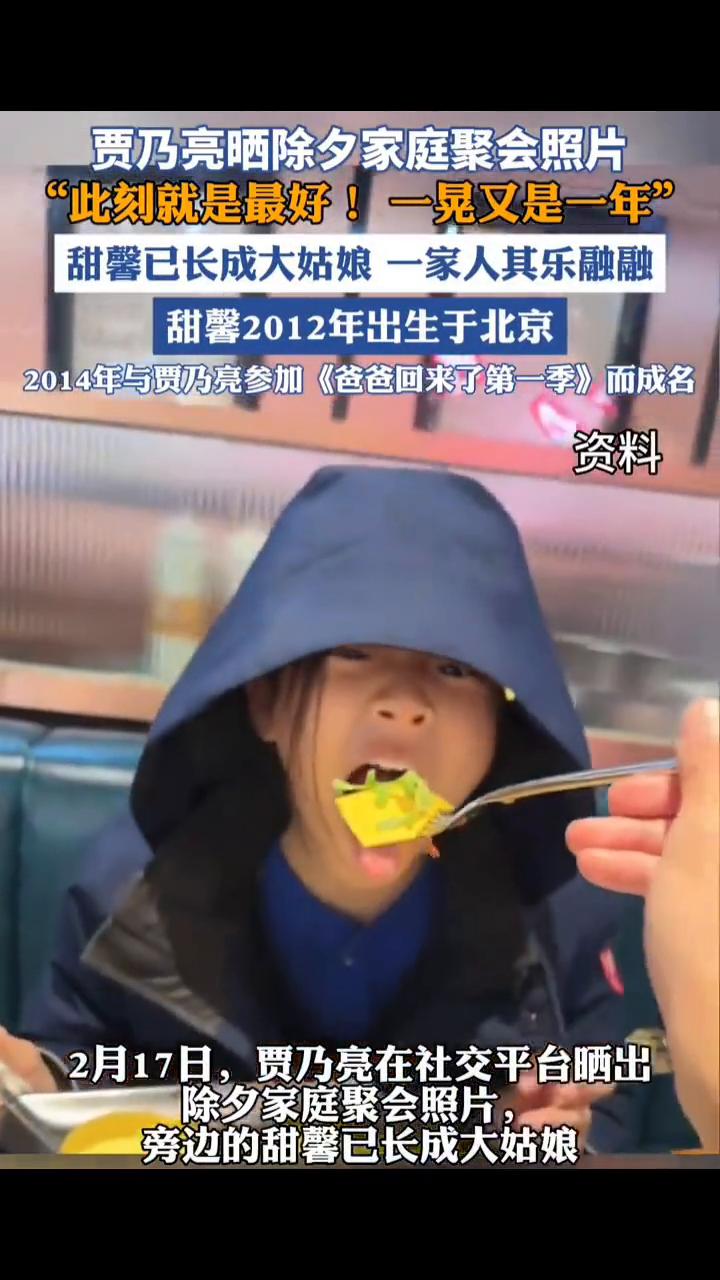 贾乃亮晒除夕家庭聚会照片,"此刻就是最好!一晃又是一年",甜馨已长成大姑娘,一家人其乐融融。 甜馨2012年出生于北京,2014年与贾乃亮参加《爸爸回来了第一季》而成名。2月17日,贾乃亮在社交平台晒出除夕家庭聚会照片,旁边的甜馨已长成大姑娘。