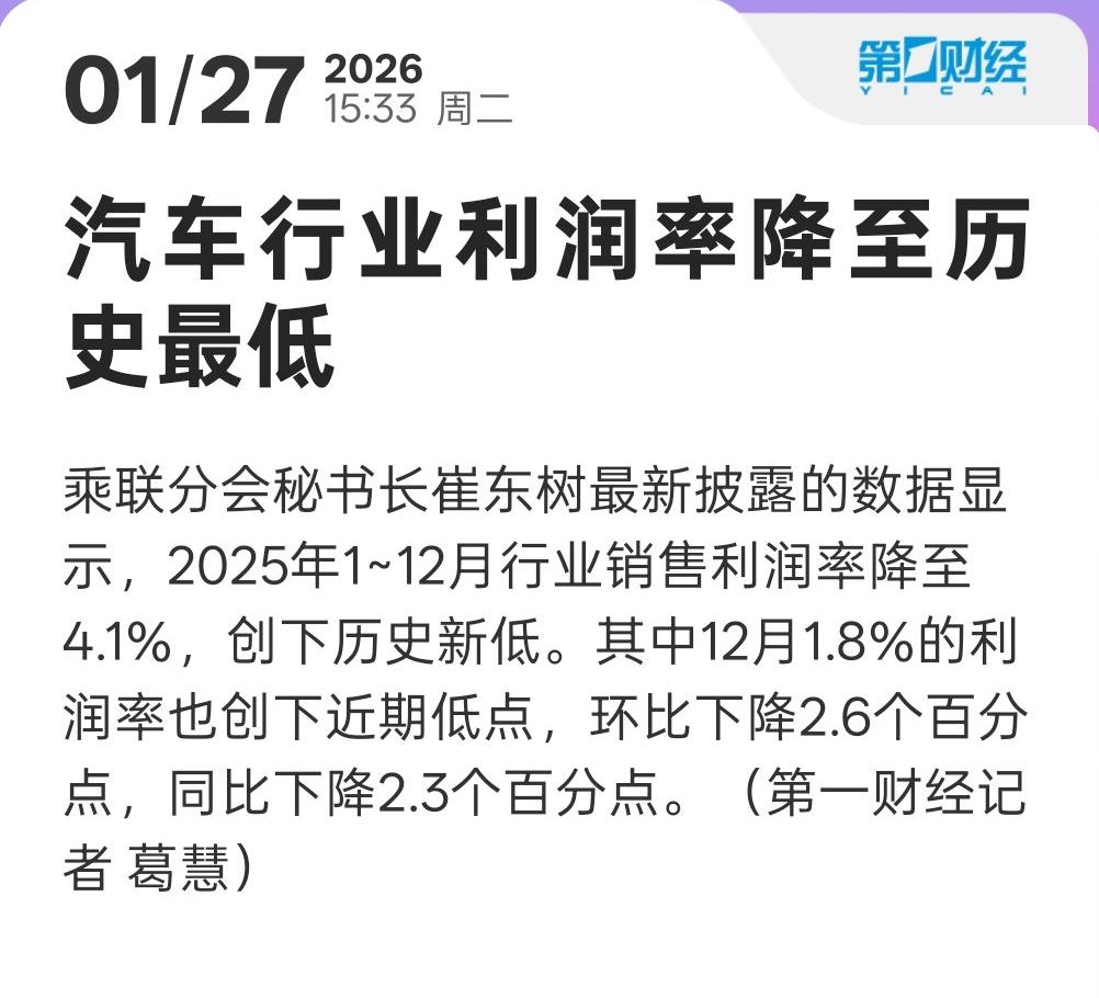 车圈以销量论英雄的弊端已经出现了,2025年国内汽车行业利润率已经降到4%左右,比前几年明显下滑,利润总额同比也是下降的。卖得多,赚的少,越卖利润越薄,这不是一个健康的信号。 甭管车多烂,只要一说省油够便宜就卖的出去,什么样的认知催生什么样的产品,典型的劣币驱逐良币,当务之急是赶紧进入产能淘汰赛,对不符合国标的车型进行通报,淘汰落后产能。 今年的竞争进一步加剧,看谁能笑到最后。