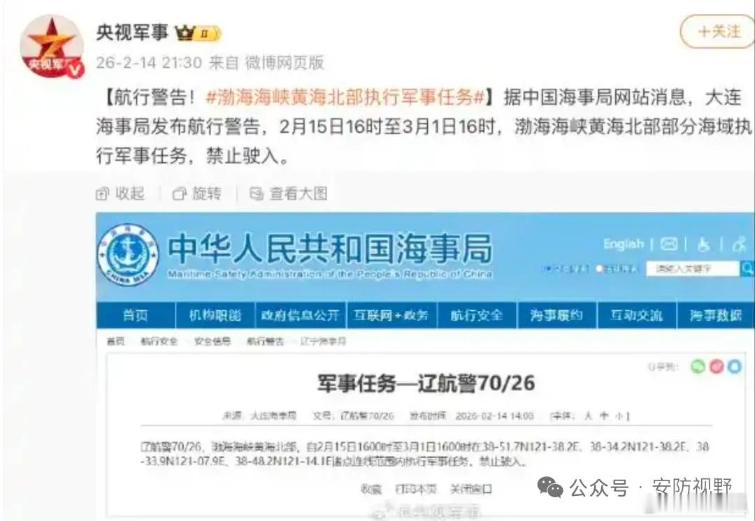 言语交锋之后,中国立即以实际行动亮明捍卫国家利益的硬实力。中国大连海事局发布航行警告,2月15日至3月1日在渤海海峡黄海北部相关海域执行军事任务,禁止无关船只驶入。