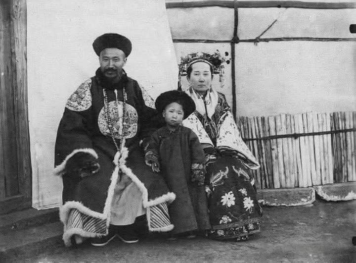这张照片拍摄于1904年的内蒙古哲里木盟,定格了乌泰王与王妃及幼子在家门口的瞬间,是清末蒙古王公生活的珍贵影像。 乌泰王(左侧),作为科尔沁右翼前旗的末代札萨克图郡王,他身着带有龙纹补子的清代郡王朝服,头戴顶戴花翎,颈挂朝珠,是典型的清代蒙古王公装扮。 乌泰是清末民初内蒙古历史上一位极具争议的人物,他出身于科尔沁右翼前旗的蒙古贵族家庭,早年曾出家为喇嘛,后还俗继承王位。因在处理旗地放垦事务中私吞荒银,多次被清廷革职留任。 1911年辛亥革命后,受外蒙古独立浪潮和沙俄势力的怂恿,乌泰于1912年8月在葛根庙宣布“东蒙古独立”,试图脱离中国。但这场叛乱很快被北洋政府和东三省军队镇压,他本人逃亡外蒙古,最终于1920年客死他乡。