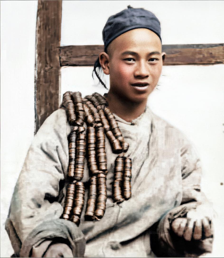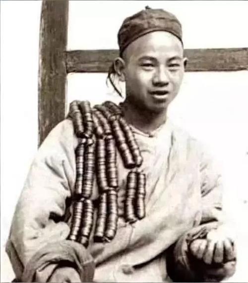 这张照片是清末民初活跃在市井中的钱商(也叫“钱串子”“钱贩子”),他们的工作是在市场上兑换铜钱和银两,肩扛的是用绳子串起来的成吊铜钱。 他肩上盘绕的是一吊吊的铜钱,每串约1000文,称为“一吊”。在当时,铜钱是民间主要的流通货币,而银两多用于大宗交易,钱商的工作就是在两者之间兑换,赚取差价。 他们并非“财大气粗”,这些铜钱只是他们的“工作道具”,这些钱商看似与大量钱财为伴,但这些钱都不属于他们,他们只是在为生计奔波。钱商的利润微薄,主要依靠频繁的小额兑换和对银钱比价的敏锐判断,是当时商品经济中不可或缺的一环。