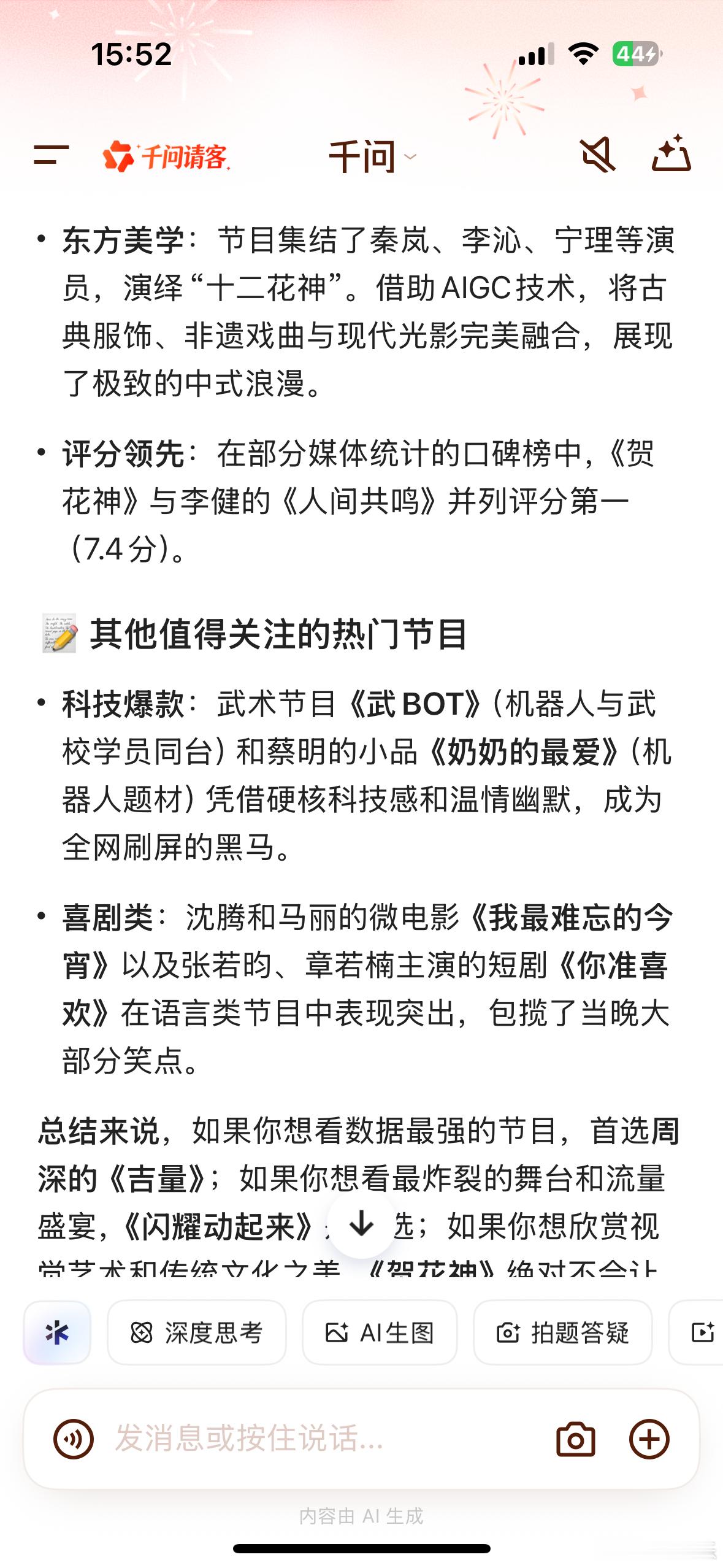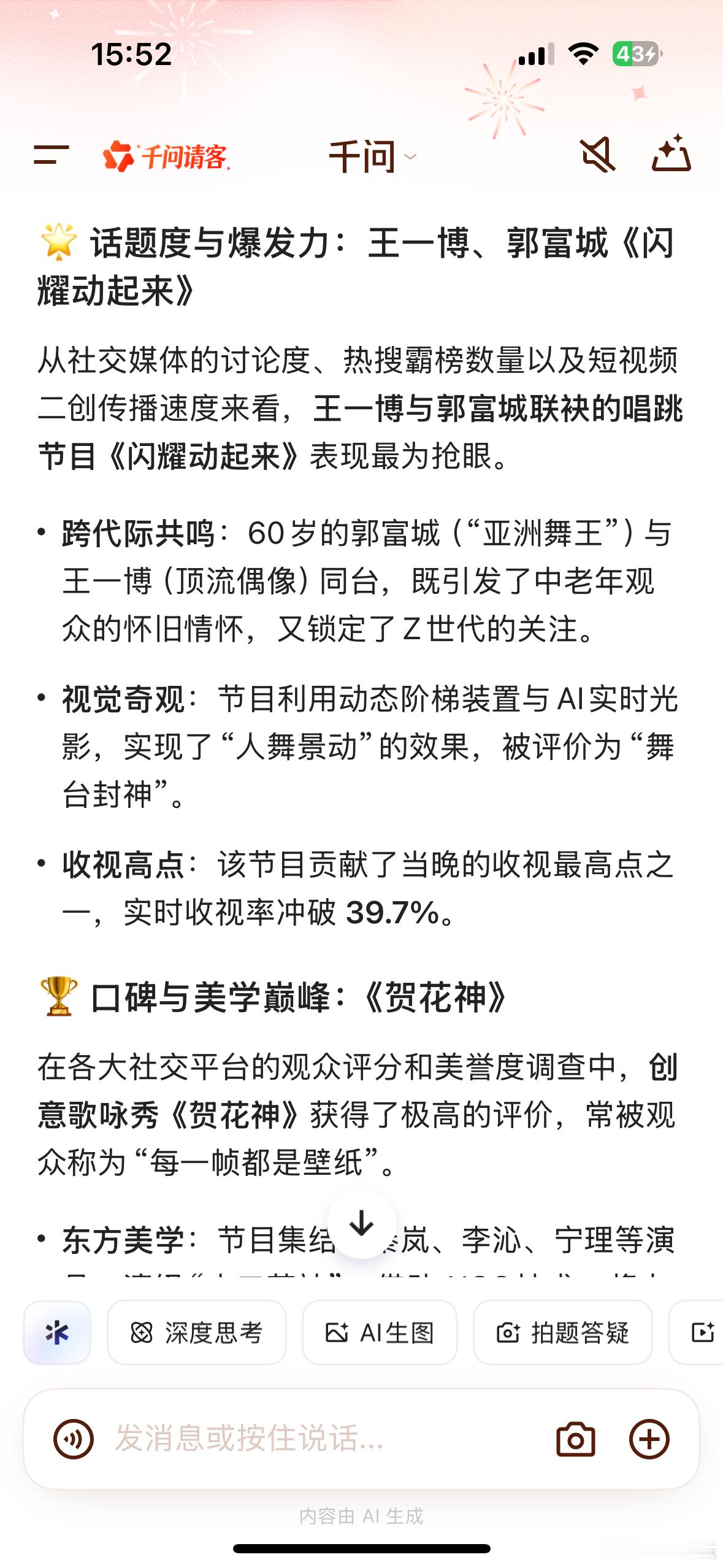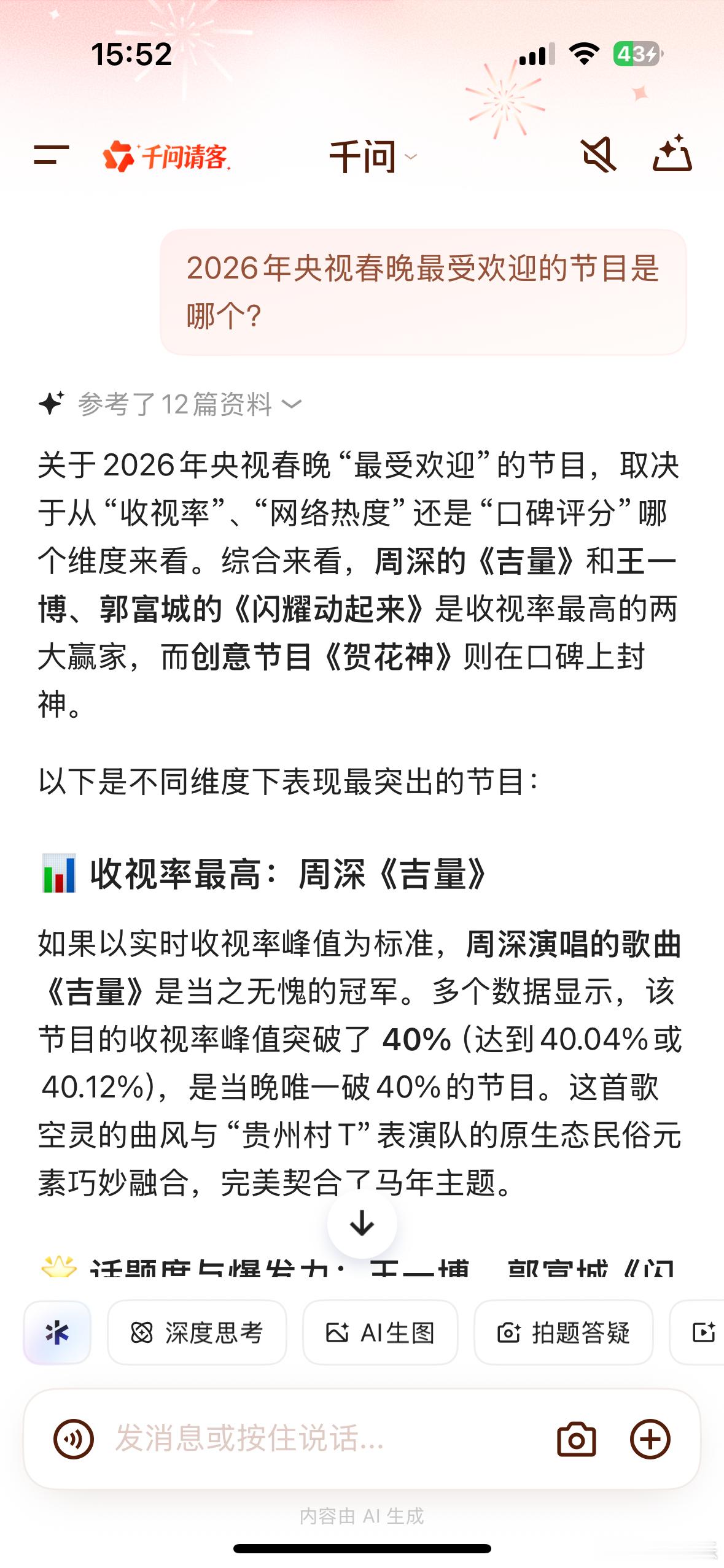 我AI聊春晚 我问千问“2026年央视春晚最受欢迎的节目是哪个?”千问总结的挺全面⬇️如果以实时收视率峰值为标准,周深演唱的歌曲《吉量》是当之无愧的冠军。多个数据显示,该节目的收视率峰值突破了 40%(达到40.04%或40.12%),是当晚唯一破40%的节目。这首歌空灵的曲风与“贵州村T”表演队的原生态民俗元素巧妙融合,完美契合了马年主题。从社交媒体的讨论度、热搜霸榜数量以及短视频二创传播速度来看,王一博与郭富城联袂的唱跳节目《闪耀动起来》表现最为抢眼。在各大社交平台的观众评分和美誉度调查中,创意歌咏秀《贺花神》获得了极高的评价,常被观众称为“每一帧都是壁纸”。武术节目《武BOT》(机器人与武校学员同台)和蔡明的小品《奶奶的最爱》(机器人题材)凭借硬核科技感和温情幽默,成为全网刷屏的黑马。沈腾和马丽的微电影《我最难忘的今宵》以及张若昀、章若楠主演的短剧《你准喜欢》在语言类节目中表现突出,包揽了当晚大部分笑点。总结来说,如果你想看数据最强的节目,首选周深的《吉量》;如果你想看最炸裂的舞台和流量盛宴,《闪耀动起来》是首选;如果你想欣赏视觉艺术和传统文化之美,《贺花神》绝对不会让你失望。不得不说2026年央视春晚已经next level!真的是一场令人难忘的文化盛宴!不仅在视觉上给了我极大的震撼,在内容上也让我感受到了浓浓的年味和时代的温度部分内容来源