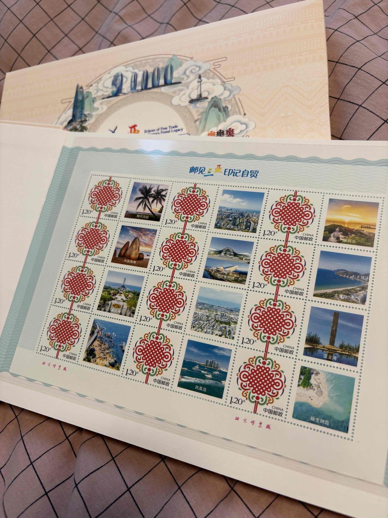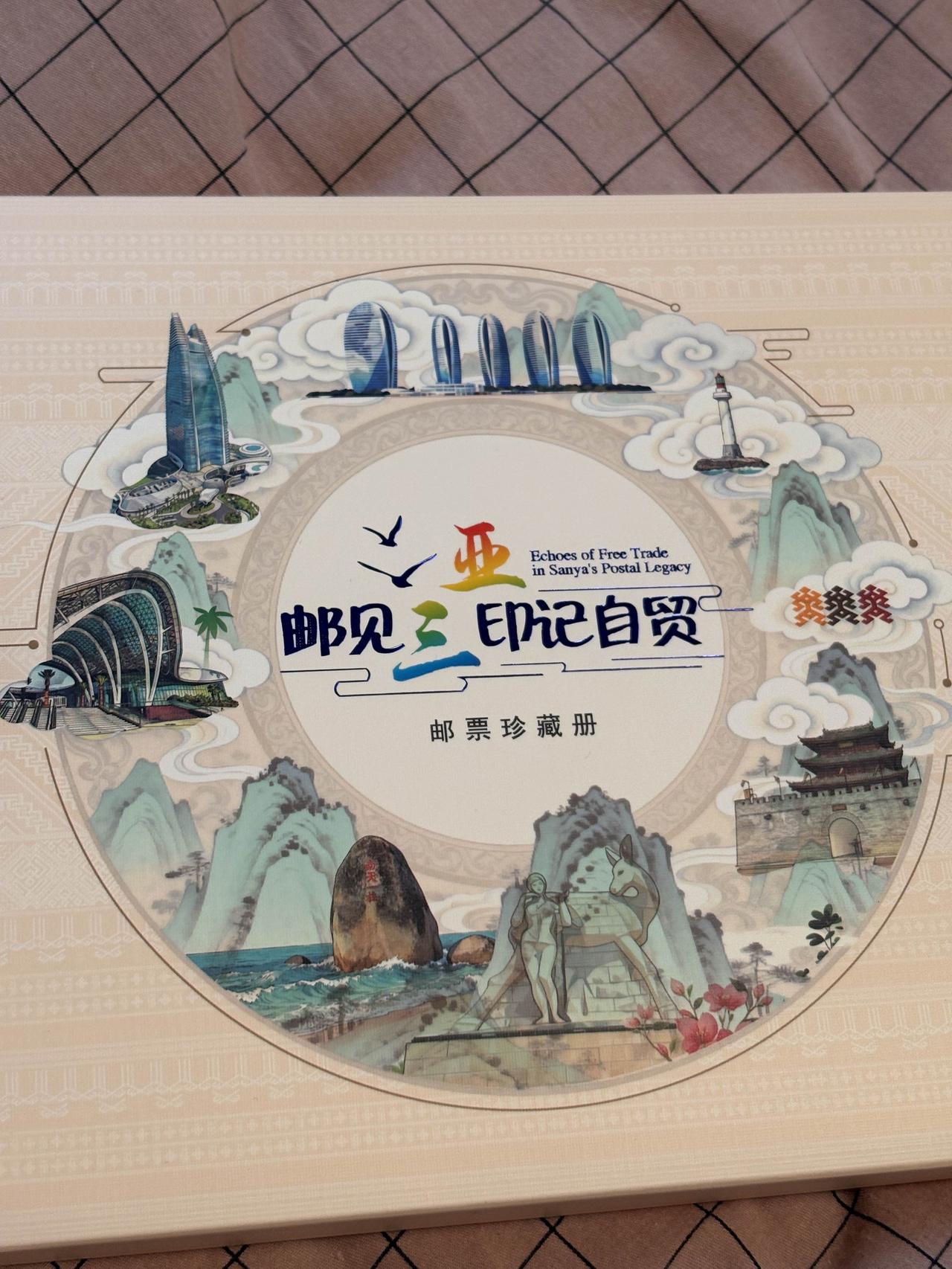 一封来自三亚旅文局的邮件静静躺着,拆开时,三亚的阳光就这样漏了出来。 不是惯常的明信片,而是一本邮册:《邮见三亚·印记自贸》。封面烫金的波浪线像极了凤凰岛那排贝壳建筑在落日里的剪影。 指尖轻触,方寸间的三亚次第展开。 邮册被分为四个章节:“邮见城长、邮见匠心、邮见潮涌、邮见风华”。从海南建省的纪念票,到海上丝绸之路的古船,再到2025年海南自贸港特种邮票。 最喜欢那枚表现免税城的票品。4A级景区的认定,设计者用了烫金工艺,光影流转间,像极了海棠湾夜晚不熄的灯火。而崖州湾科技城的画面里,深海潜器与南繁稻穗构成奇妙的蒙太奇——三亚不止有浪花,还有正在改变未来的实验室。