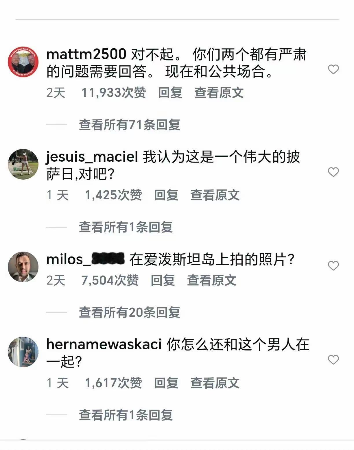 这是史上最虚伪的情人节秀,没有之一。 明知道一个感情上、身体上劣迹斑斑的老男人,她还是大方地秀了下恩爱,结果评论区翻车了。 美国网友看了多欢乐啊!情人节当天最好笑的泡沫“剧”。也不知道为何她有这样大的勇气发这样的图文呢?