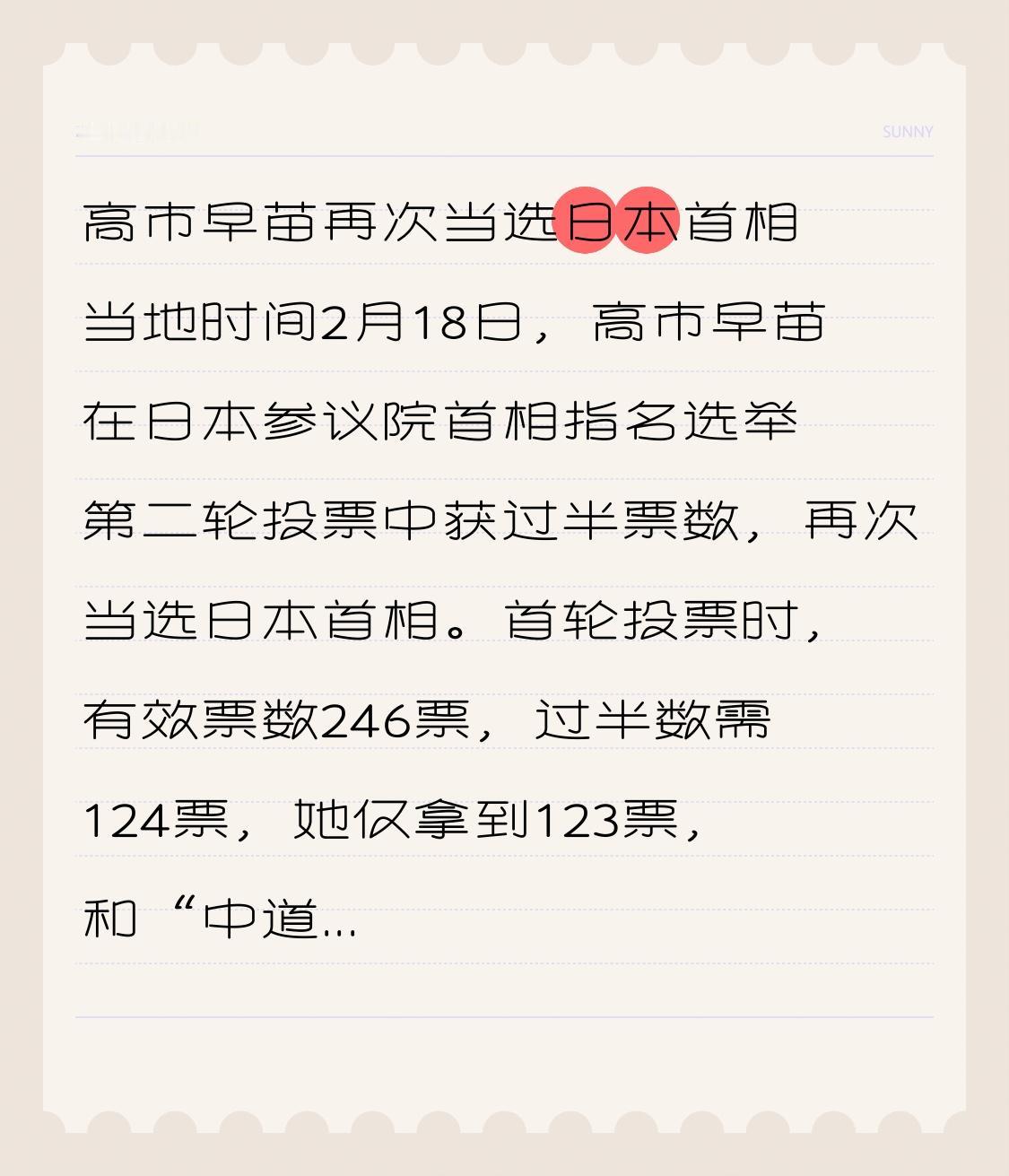 高市早苗再次当选日本首相 当地时间2月18日,高市早苗在日本参议院首相指名选举第二轮投票中获过半票数,再次当选日本首相。首轮投票时,有效票数246票,过半数需124票,她仅拿到123票,和“中道改革联合”党代表小川淳也进入第二轮。 高市早苗当选首相,后续日本的内外政策走向值得关注。她所在的自民党在日本政坛影响力大,其决策可能会对地区局势产生影响。希望日本能在新首相带领下,多为地区和平稳定做积极贡献,而不是搞些小动作。
