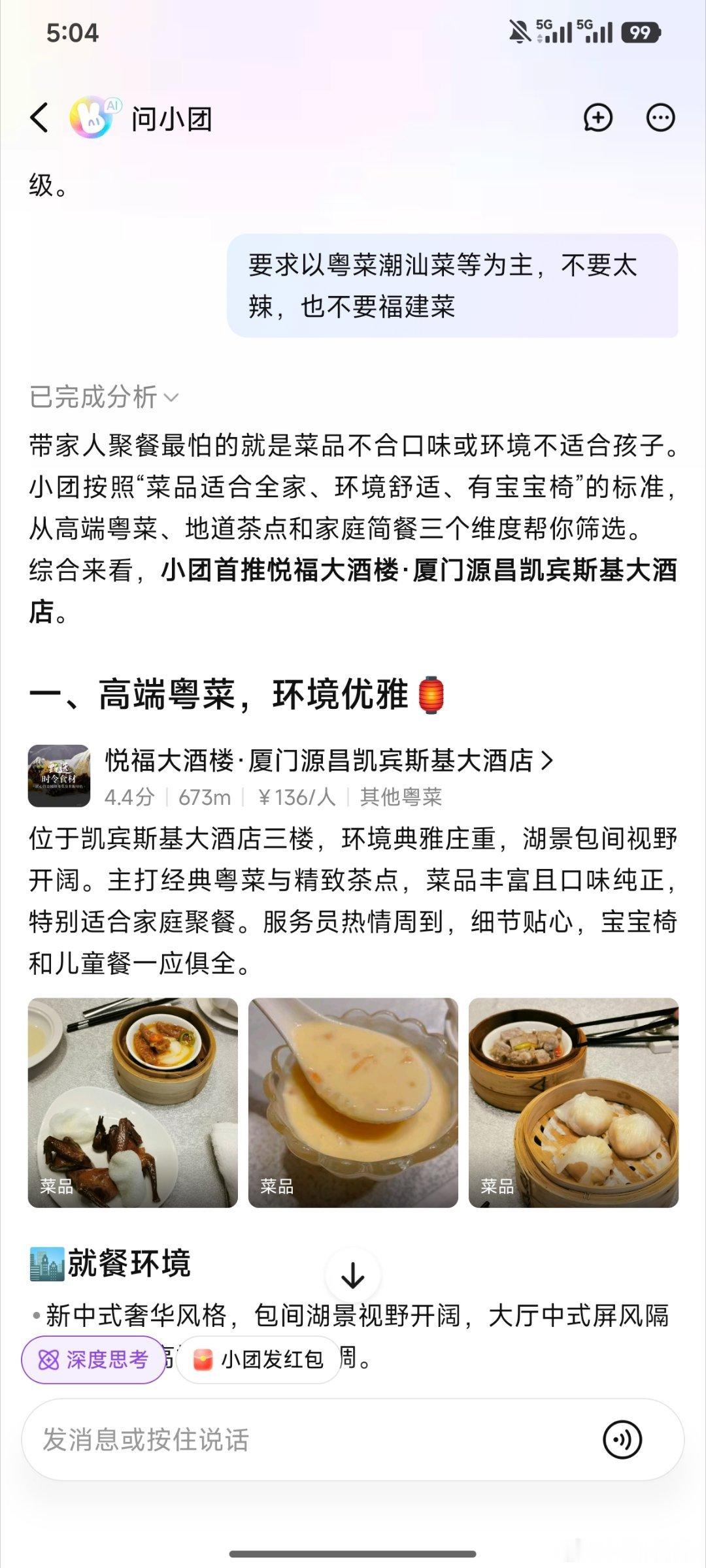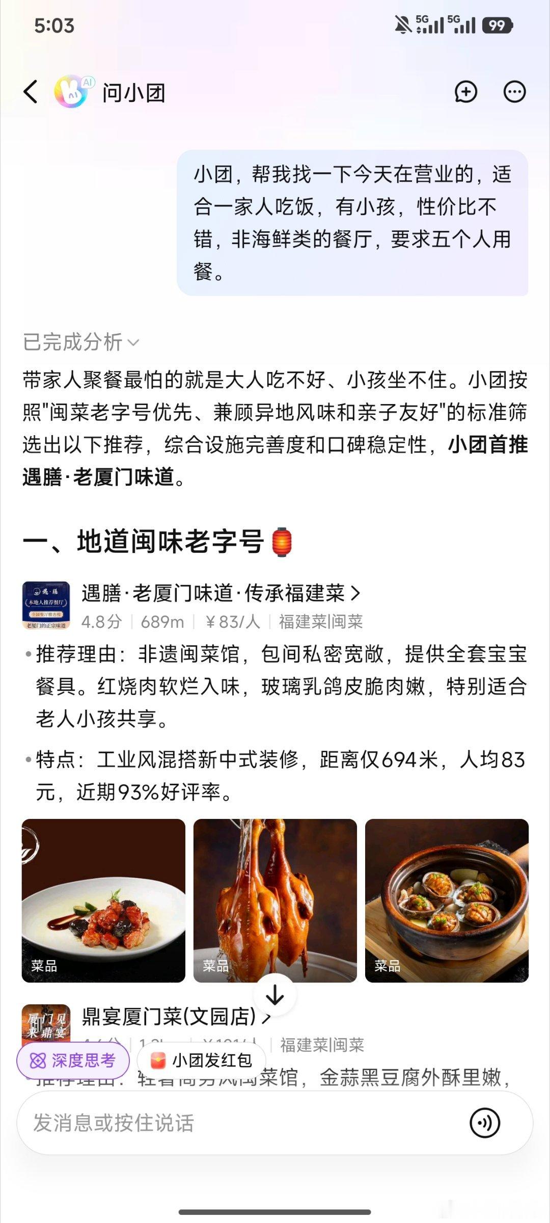 感觉今年春节就是在体验各种新鲜玩法了,从春晚的机器人开始进化到练武术,再到AI可以包饺子、做拜年视频。不过春节期间AI最重要的价值还得是出门吃喝玩乐“不踩坑”。最近在厦门旅游一直在用美团打车、找吃的,一个问小团的按钮引发了我的兴趣,看也是一个AI工具,亲测了一下的确在走路的过程中很省事,语音就能输入,可以把需求直接告诉他,直接规划出合适吃饭的店,筛掉还在营业且口碑好的餐厅,倒是省事多了,这个功能后续可以直接安利给爸妈,的确很方便。