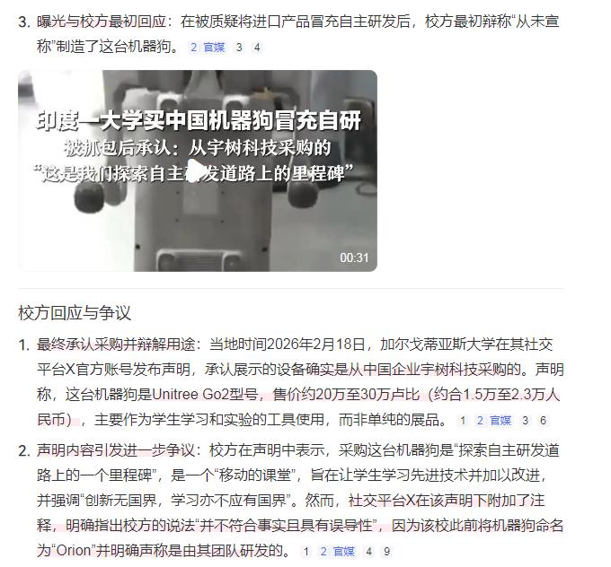 印度大学的学术造假是真的大胆! 印度加尔戈蒂亚斯大学的团队,展示了一台名为“Orion”的机器狗,向媒体介绍称这是该校团队自主研发的产品。这块机器狗与宇树科技已上市的UnitreeGo2机器狗,外观细节完全一致,并无改装痕迹。2026年2月18日,加尔戈蒂亚斯大学发布声明,承认展示的设备,确实是从宇树科技采购的机器狗。 对于印度这所大学的操作,只能说是很傻很天真,竟然就这么赤裸裸地试图蒙混过关,从而得到印度政府,或者企业的投资,来研发机器狗。但是现在的世界是网络世界,不是说随随便便就能蒙混过关。可以理解印度大学的心情,想要发展电子狗。但是一口吃不成个胖子,科技发展要一步步地来,而不是蒙混过关一样的抢夺,剽窃别人家的作品,讲白一点是不行的。 博主不明白印度大学为何会如此操作,因为很明显不是自己的产品,哪怕想要蒙混过关,得到更多的投资。但是突破的产品,一样还是会被找麻烦的。但是不明白,印度大学就这么赤裸裸地把宇树科技的机器狗,作为自己的研发产品来宣传,实在是有点过于低估外界的智商了。 也可能是印度这家大学的某些负责人,实在是过于急功近利,想要一战成名,但是没想到后果,可是最终藏不住了,最终只能无奈地接受现实,公开承认事实,实在是不明智呀。