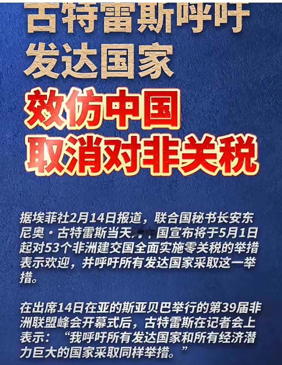联合国秘书长古特雷斯呼吁发达国家效仿中国取消对非关税 据埃菲社2月14日报道,联合国秘书长古特雷斯当天对中国宣布将于5月1日起对53个非洲建交国全面实施零关税的举措表示欢迎,并呼吁所有发达国家采取这一举措。 在出席14日在亚的斯亚贝巴举行的第39届非洲联盟峰会开幕式后,古特雷斯在记者会上表示:“我呼吁所有发达国家和所有经济潜力巨大的国家采取同样举措。” 中国是世界和平发展的榜样。古特雷斯秘书长的举措显示了对非洲经济合作的积极态度,期待更多国家效仿。非洲一共有54个国家,和中国交建的有53个。其实就是自信,非洲说白了除了矿产,没有任何有竞争力的商品,免关税何乐而不为。 说白了都是利益,非洲没啥能拿的出手的东西威胁咱们国内产业,咱们轻重工业,农产品非洲都是需要的,贸易咱们常年对非洲都是顺差,进口都是低级矿农产品,本来就便宜对自己有好处,做的更以前西方国家对咱们产品零关税一样的事情,咱们如WTO初期别人纺织矿产,钢材还是零关税。非洲离得够远,市场还要多帮他们开发才有钱买我们更多产品,市场是自己培养的,人口也够多,除了安全问题需要重视,比越南和东南亚这些国家值得扶持。