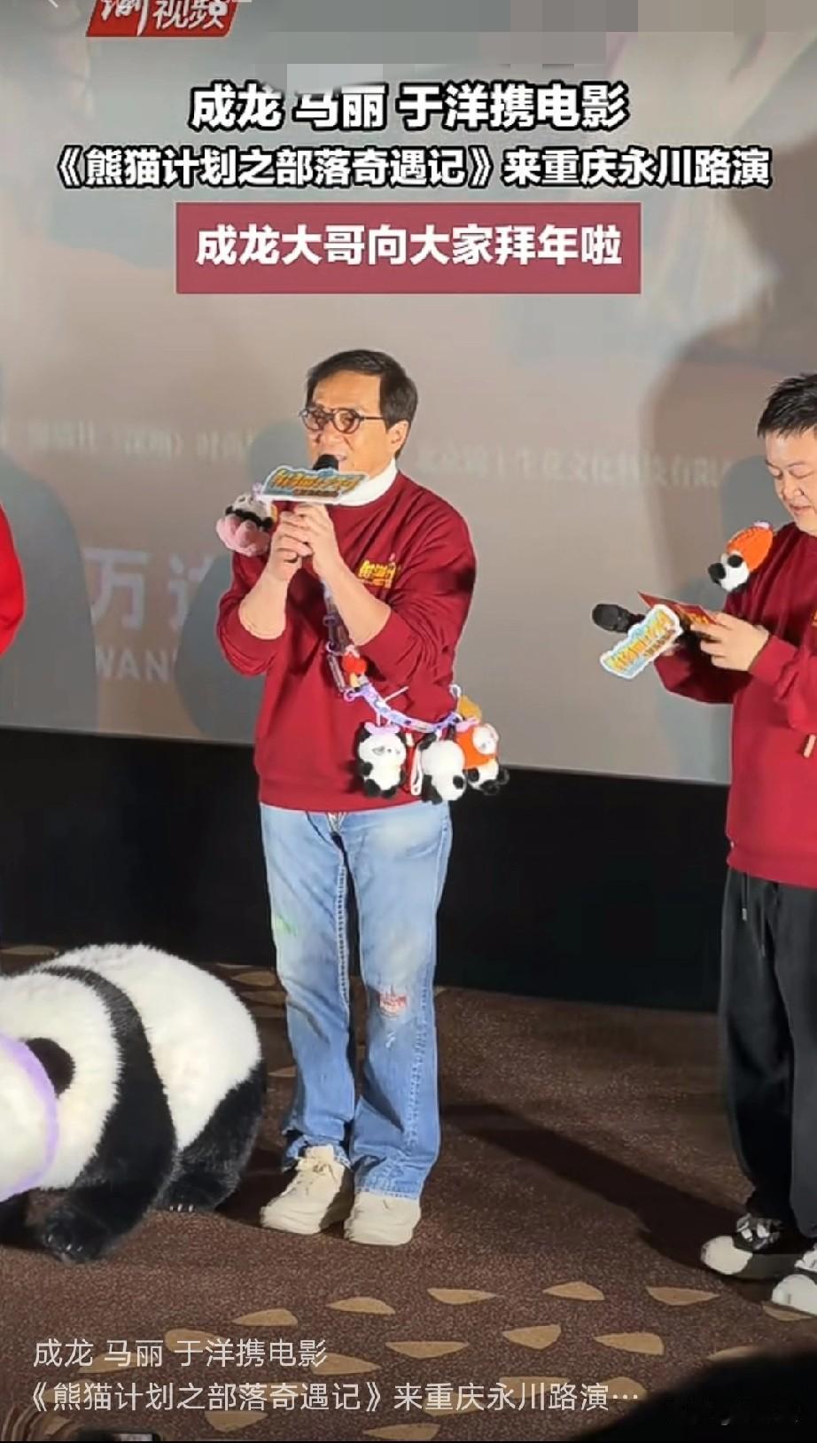 熊猫好可爱! 成龙 ,马丽 ,于洋携电影 《熊猫计划之部落奇遇记》来重庆永川路演。 成龙大哥向大家拜年啦!
