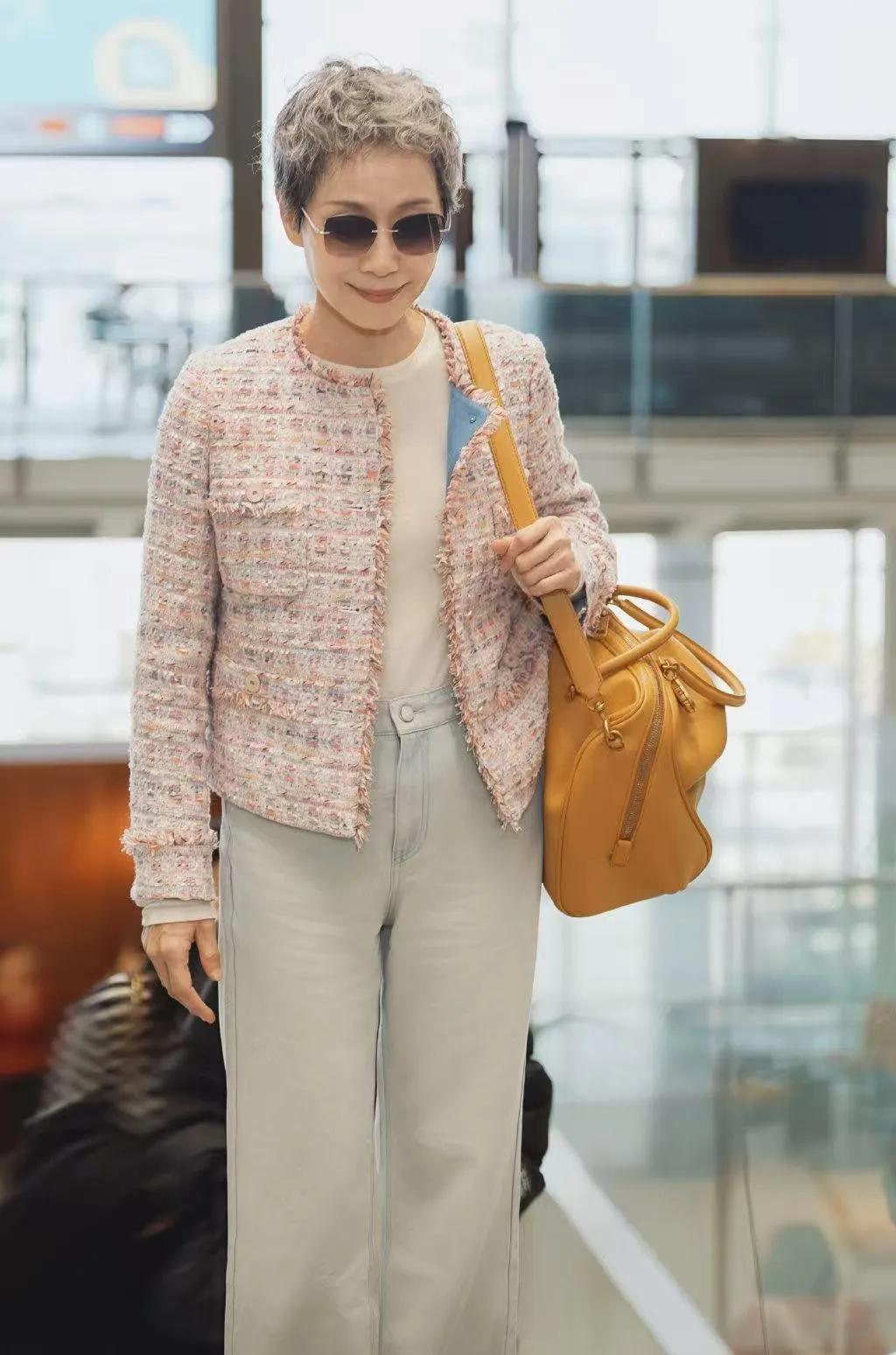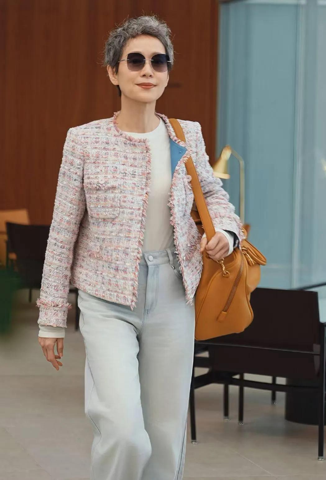 叶童的老年穿搭太会了!💖 粉色粗花呢外套+浅灰牛仔裤,清爽又减龄,完全没有“大