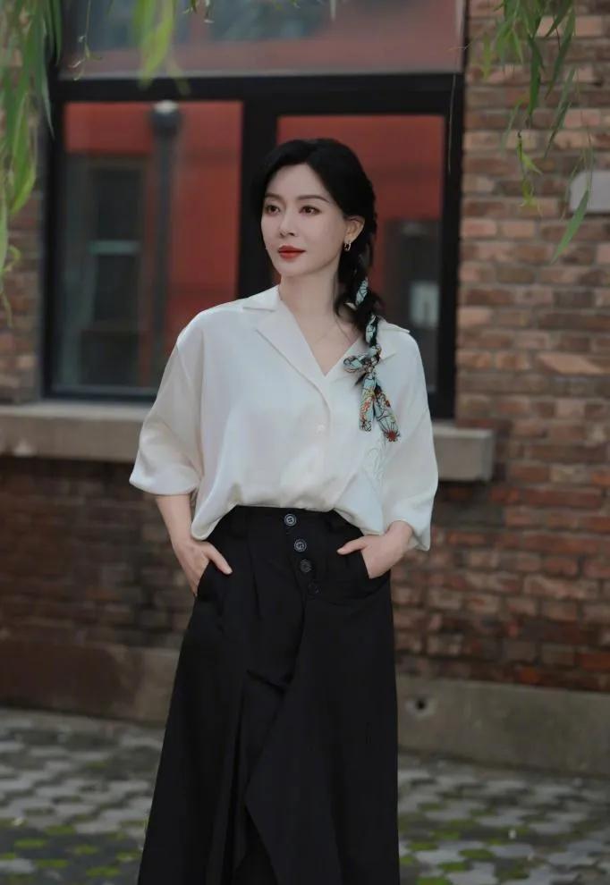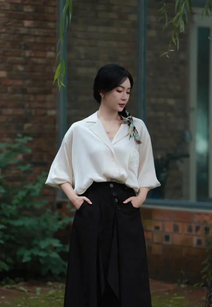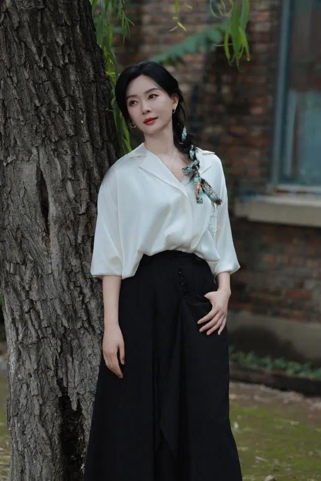 陈数的中年穿搭,把“高级感”拿捏得死死的!✨ 缎面白衬衫+黑色长裙,简约又大气,丝巾编发细节拉满。 这气质,真的是岁月沉淀的优雅范本。 陈数 中年穿搭