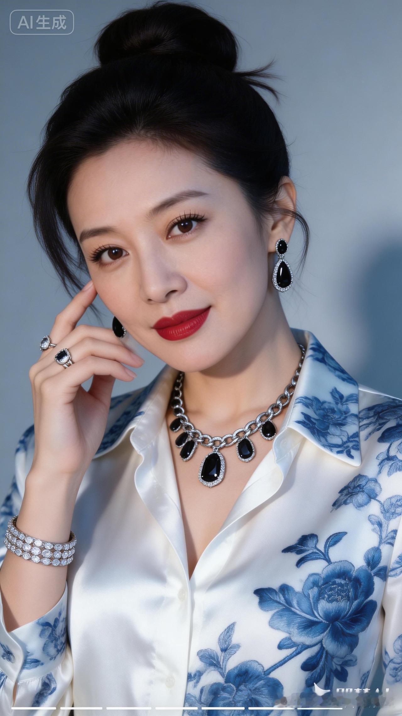 优雅蓝花衬衫,复古珠宝搭配,尽显女性魅力!