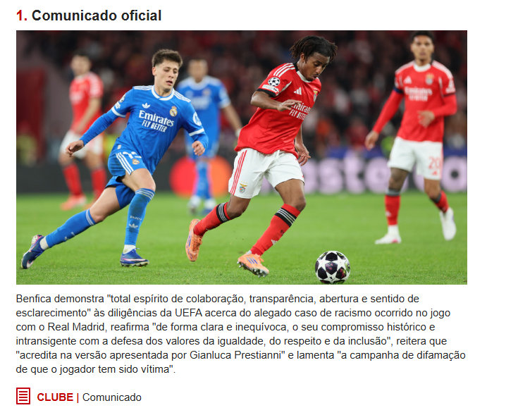 本菲卡官方公告:“本菲卡俱乐部就此前对阵皇家马德里比赛中被指控的种族主义事件,对欧足联今日宣布的相关调查程序,秉持全力配合、透明、开放及澄清事实的态度。