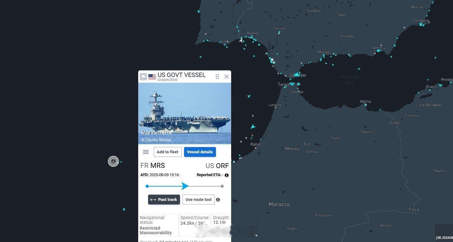 据可靠消息,美国“杰拉尔德·R·福特”号航母已穿过直布罗陀海峡并现身摩洛哥海岸附近。