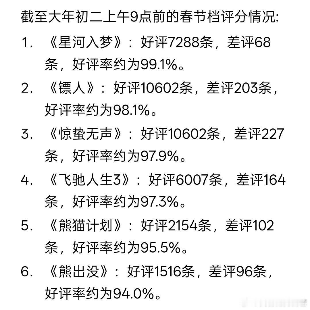 截止初二上午9点,春节档电影评分情况数据来自TPP购票评价:1. 《星河入梦》:好评7288条,差评68条,好评率约为99.1%。2. 《镖人》:好评10602条,差评203条,好评率约为98.1%。3. 《惊蛰无声》:好评10602条,差评227条,好评率约为97.9%。4. 《飞驰人生3》:好评6007条,差评164条,好评率约为97.3%。5. 《熊猫计划》:好评2154条,差评102条,好评率约为95.5%。6. 《熊出没》:好评1516条,差评96条,好评率约为94.0%。你看了了几部了?