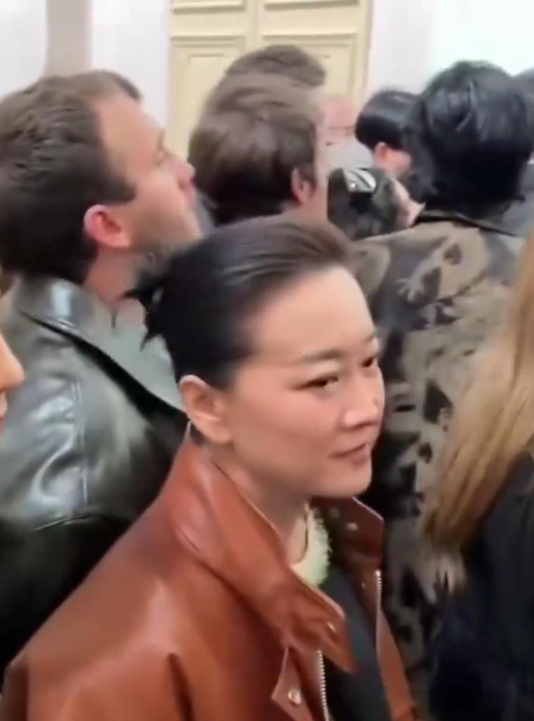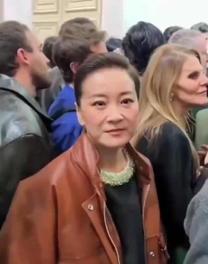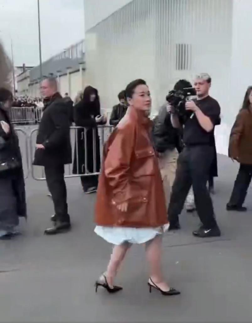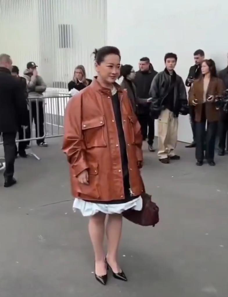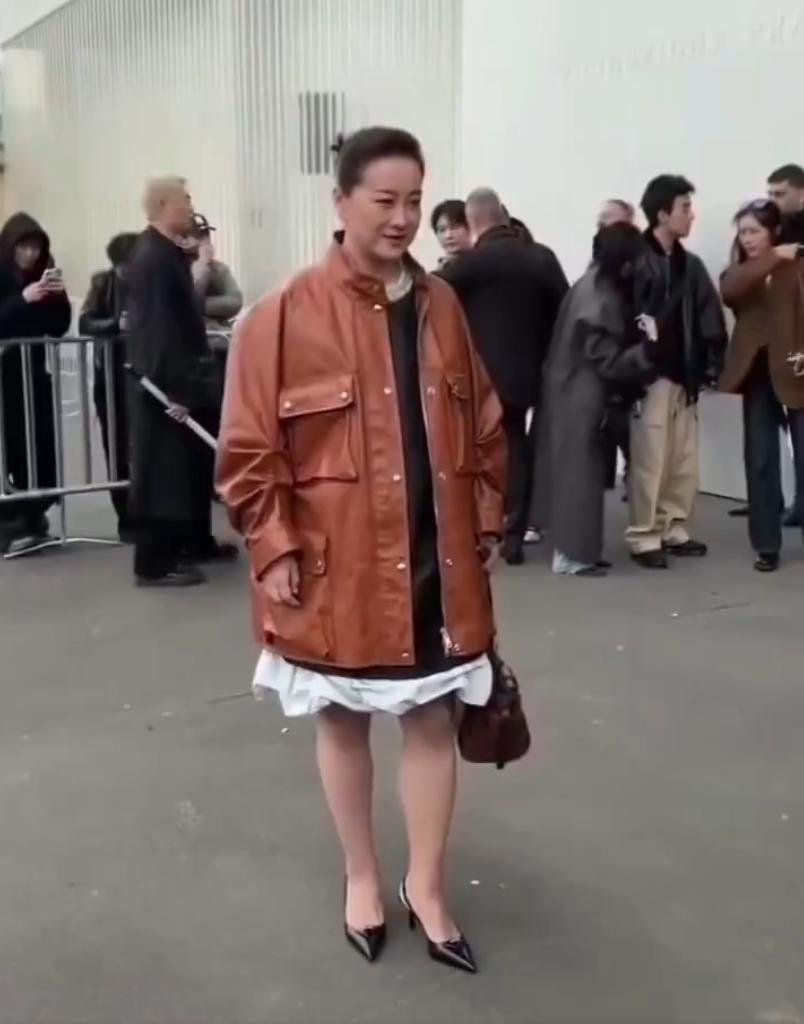 演员兼导演贾凌近期一场2026年的时尚活动,视频中贾凌身穿宽松的锈红色皮夹克和荷叶边连衣裙,在闪光灯和人群中笑容灿烂,象征着她向高级时尚和赋权主题的转型。
