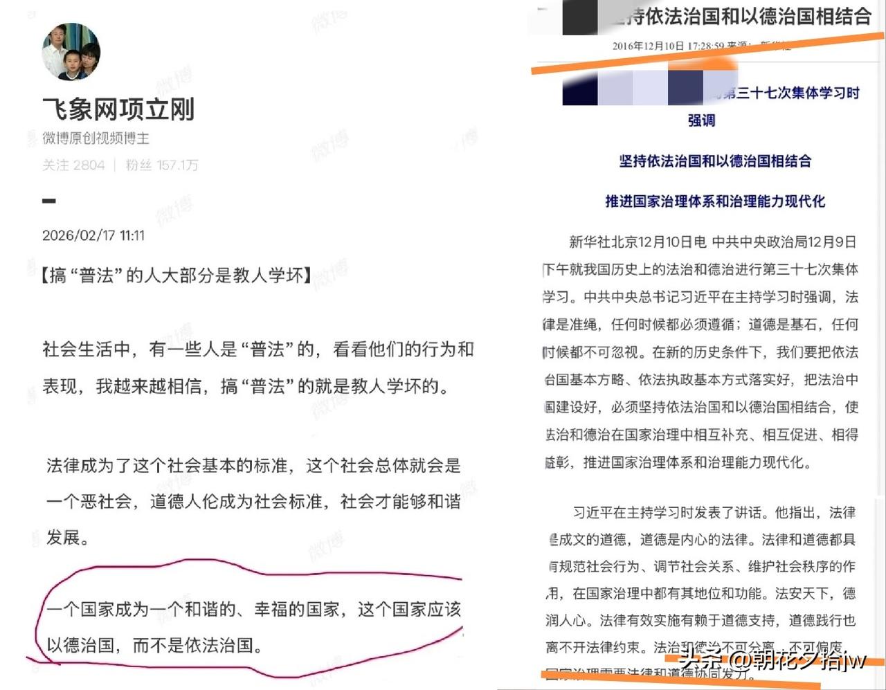 项立刚摊上事了! 不知酒喝多了,还是饺子吃撑了。 大年初一就胡言乱语: “一个国家成为一个和谐的幸福的国家,这个国家应该以德治国,而不是依法治国”! 而国家强调:坚持依法治国和以德治国相结合。 法治和德治相辅相成、不可偏废。 换句话说,国家从来没有说过“只要法治,不要德治”。 也从来没有说过“用德治取代法治”。 项立刚作为一个有影响力的公众人物,公开宣称不应该依法治国! 太偏激了! 这已经不是简单的观点表达, 而是和国家政策相抵 触! 他还以为戏耍罗永浩“不懂还没有自知之明”一样。 这次事闹大了, 恐怕没这么简单!