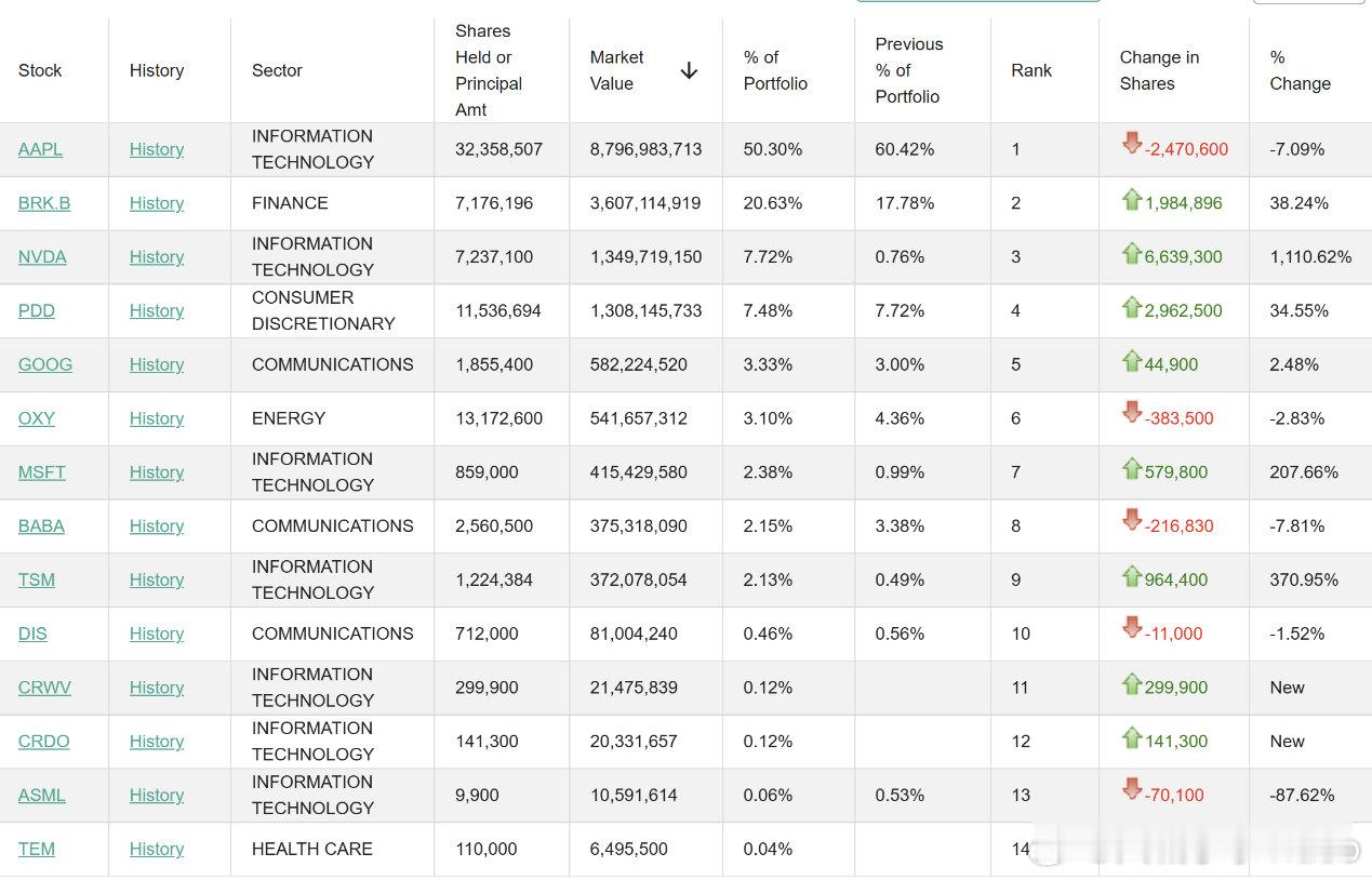 从整体持仓情况看,H&H International Investment共持有14家公司,包括苹果、伯克希尔·哈撒韦、英伟达、拼多多、西方石油等。