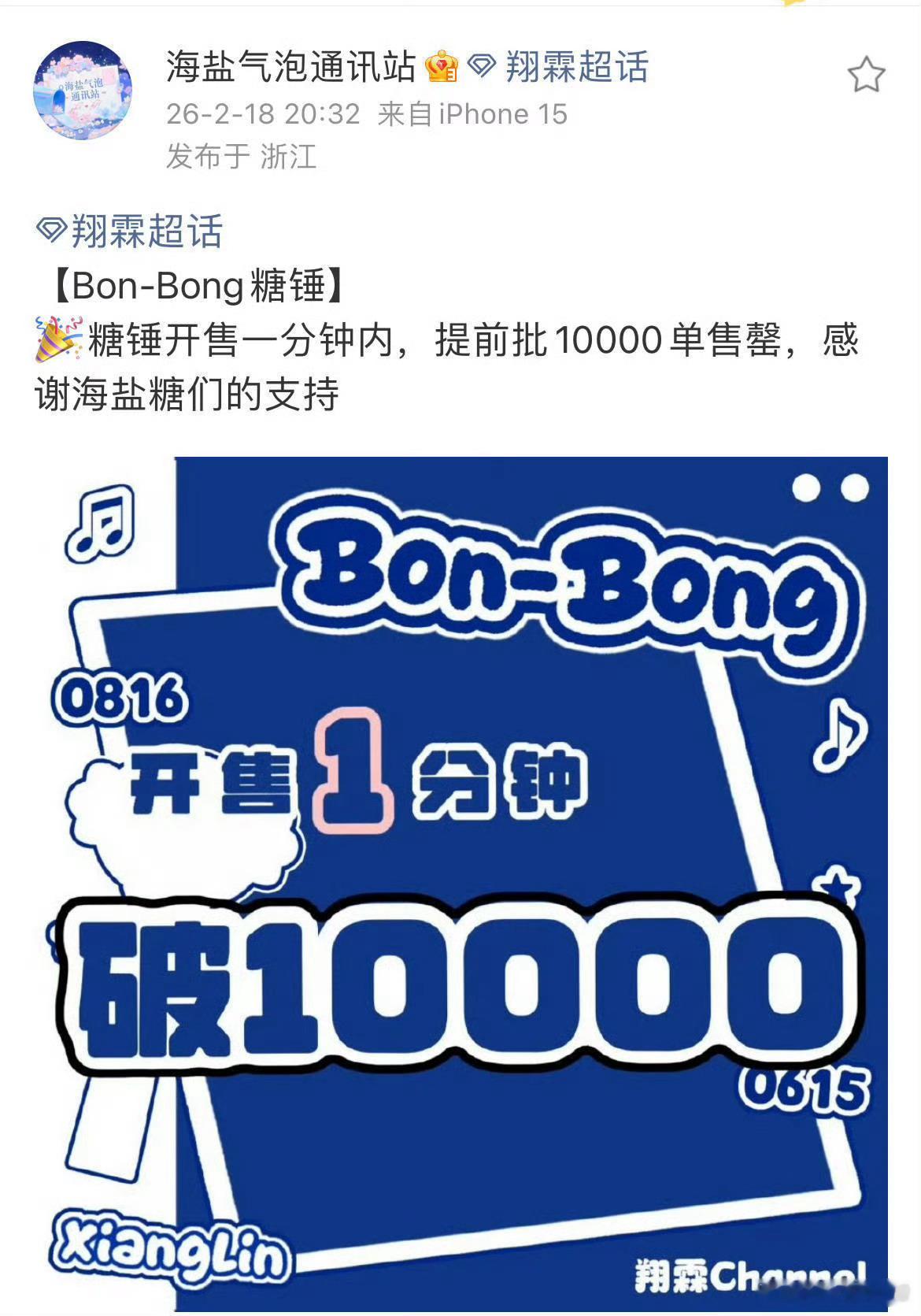 翔霖应援棒40秒售罄翔霖专属应援棒“糖锤”的提前批1万单在开售40秒内闪电售罄,