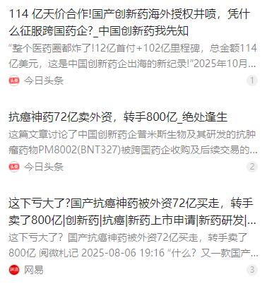 “中国亏大了”!中国自主研发的“抗癌神药”,去年6月被外资企业72亿买走,紧接着该外资又转手将其卖了800亿,利润高得都让人不敢想。 麻烦看官老爷们右上角点击一下“关注”,既方便您进行讨论和分享,又能给您带来更多优质的内容,感谢您的支持! 2025 年 6 月,医药圈一则交易消息引发热议,中国创新药企普米斯生物将自研的抗癌双抗药物 PM8002(BNT327)以约 72 亿元的价格,整体出售给德国外资企业 BioNTech,这款被业内称作 “抗癌神药” 的产品,就此易主外资。 这款药物是普米斯团队多年研发的心血,作为 PD-1 与 VEGF 双靶点抗体药,它能双重作用对抗癌细胞,既让免疫系统重新识别肿瘤,又切断其营养供应,对多种恶性肿瘤都有良好疗效,还能大幅降低传统化疗的副作用,研发阶段就被寄予厚望。 谁都没料到,这笔交易完成后没多久,收购该药物的外资企业就有了新动作,其将这款抗癌药的全球开发与商业化权益打包转售给美国 BMS,成交价格高达 800 亿元。不到一年时间,账面利润接近十倍,这一数字差让不少国人直呼 “中国亏大了”。 民众的惋惜与感慨并非空穴来风,近些年中国创新药行业终于摆脱了仿制药的老路,在核心技术上实现了实打实的突破,这款抗癌药就是典型代表。可重磅研发成果却被外资资本低价收割,最终让别人赚走了大头,巨大的心理落差油然而生。 但抛开情绪来看,普米斯生物做出出售的决定,并非是企业管理层的短视,反而是当时多重压力下的无奈选择。作为一家初创生物医药企业,公司彼时正面临着现金流告急的难题,研发创新药本就是烧钱的事,后续临床推进还需要大量资金。 除了现金流的压力,国际化能力的不足也是关键问题。普米斯虽做出了好药,却没有搭建起全球的临床研发和商业化销售网络,也缺乏对接国际药监体系的经验,想要让这款药走向全球市场,对当时的企业来说几乎是不可能完成的事。 同时,生物医药行业的估值本就波动巨大,受资本市场环境影响,当时创新药企的融资难度陡增,企业估值也出现下滑。在这样的背景下,72 亿元的交易对价是实打实的现金收益,能让企业彻底摆脱资金危机,在管理层眼中已是相对稳妥的选择。 而外资企业能实现如此高的溢价转售,靠的绝不是简单的 “中间商赚差价”,其背后是自身强大的全球资源、成熟的资本运作能力,以及在国际医药并购市场的绝对话语权。这些优势让外资能最大程度放大这款药物的商业价值。 从产业价值的角度来看,这场交易其实是一场信息、能力和话语权不对称的资本游戏。中国药企凭借扎实的研发实力,完成了药物从 0 到 1 的核心突破,承担了研发最前期的高风险,却只拿到了对应基础研发的收益。 外资企业接手后,利用自身的全球布局,将药物从 1 推向 100 的商业化阶段,这个过程看似没有核心研发的突破,却依托成熟的体系让药物的商业价值得到释放,最终赚取了这场交易里的高额利润,这也是整个事件最让人惋惜的地方。 其实在医药行业,这样的价值分配并非个例,全球生物医药产业本就有着清晰的价值链分工。初创药企往往负责前期的核心研发,完成从 0 到 1 的突破,而大型跨国药企则凭借资源和能力,负责后续的商业化落地,赚取后续的高额利润。 只是放在中国创新药发展的大背景下,这样的案例还是让人觉得可惜。中国药企用多年时间攻克技术难关,好不容易在抗癌药领域实现了技术突破,却因为产业配套能力和资本实力的差距,只能在价值分配中处于弱势地位。 但这起事件也并非全是负面,至少证明了中国创新药的研发实力已经得到了国际市场的认可。此前中国药企在国际市场上多是低价授权海外权益,而这次能让国际巨头真金白银收购,本身就是研发能力提升的体现。 更重要的是,这起交易也给中国创新药行业提了个醒,除了埋头搞研发,还要重视搭建全球化的商业化体系,提升企业的资本运作和抗风险能力。只有研发和商业化两手抓,才能让中国药企在全球医药产业的价值分配中拥有更多话语权。 如今国内也有不少药企走出了不一样的道路,有些企业选择与跨国药企达成战略合作,保留核心市场的权益和利润分成,通过 “借船出海” 的方式实现全球化,既借助了外资的资源,又守住了自己的研发成果。 中国创新药行业的发展本就不是一蹴而就的,从仿制药到原研药,从国内市场到国际市场,必然要经历这样的摸索阶段。这起 72 亿到 800 亿的交易,不是中国创新药的失败,而是成长过程中必须吸取的教训。 未来随着中国医药产业的不断成熟,随着更多药企搭建起全球化的能力,相信中国研发的创新药,不仅能造福国内患者,更能在全球市场上赚取属于自己的价值,让核心研发成果的价值真正掌握在中国人自己手里。