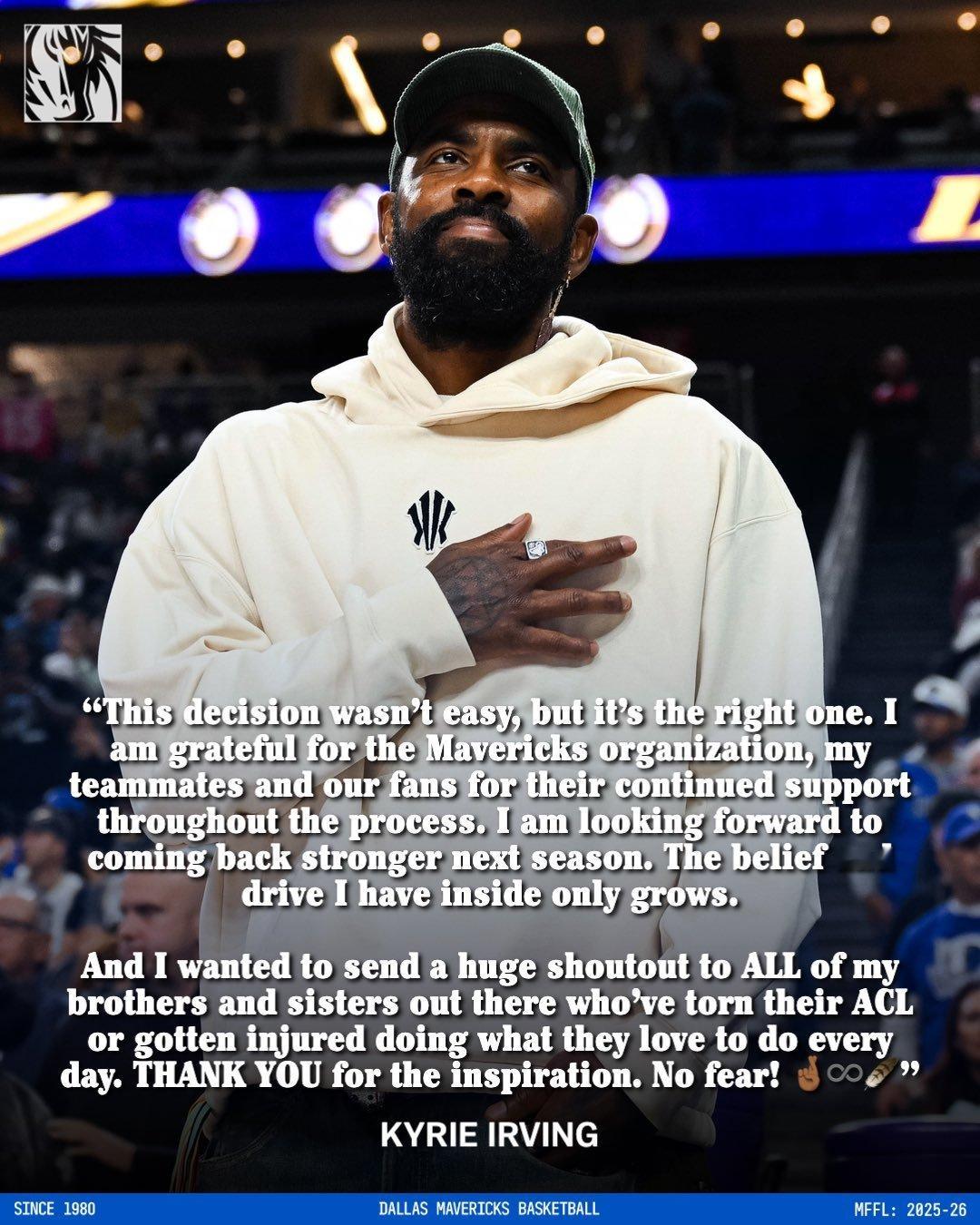 Dallas Mavericks star Kyrie Irving will miss the season to allow himself additional time to fully heal from the torn ACL he suffered last March. Irving will make his return for the 2026–27 season.