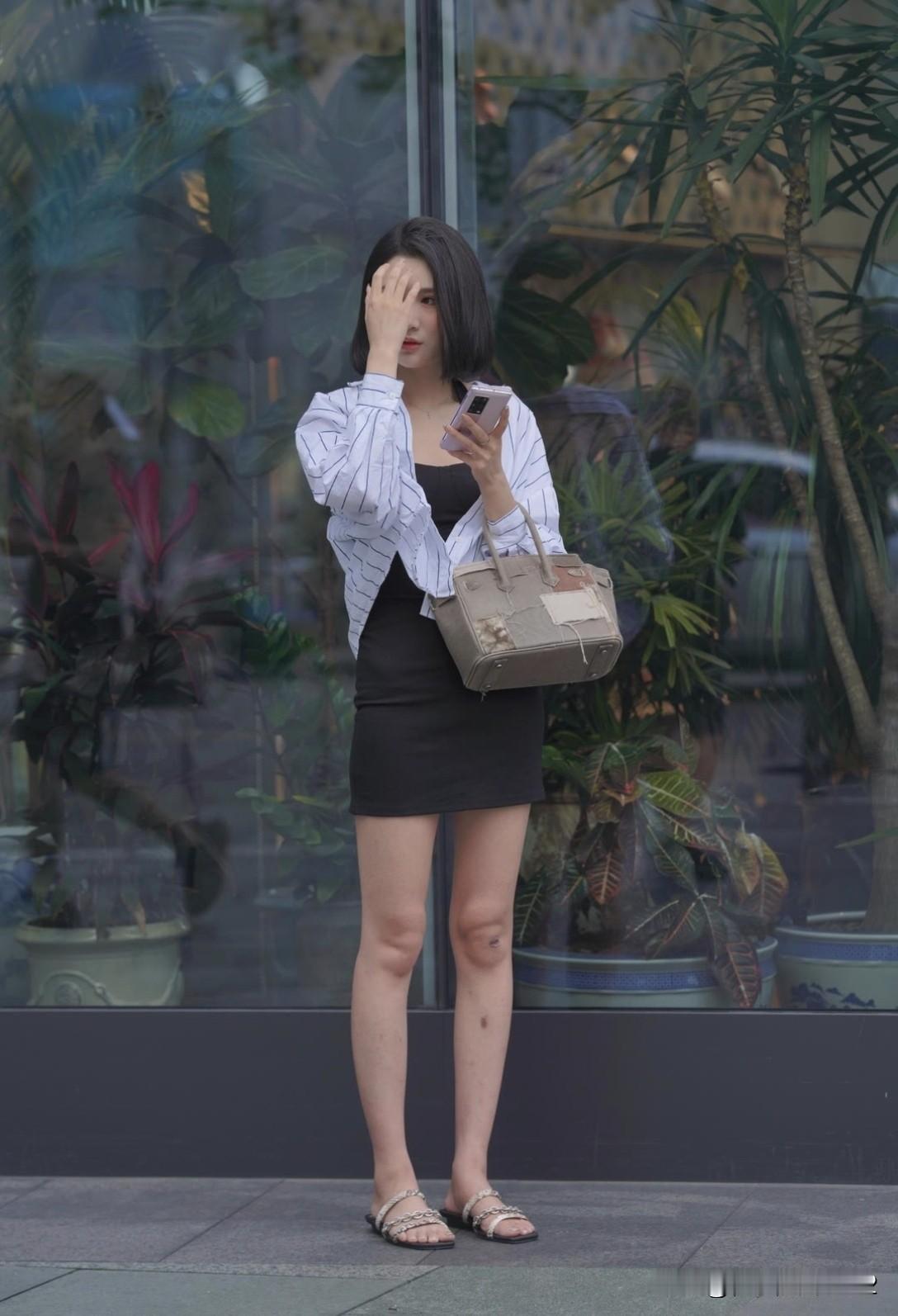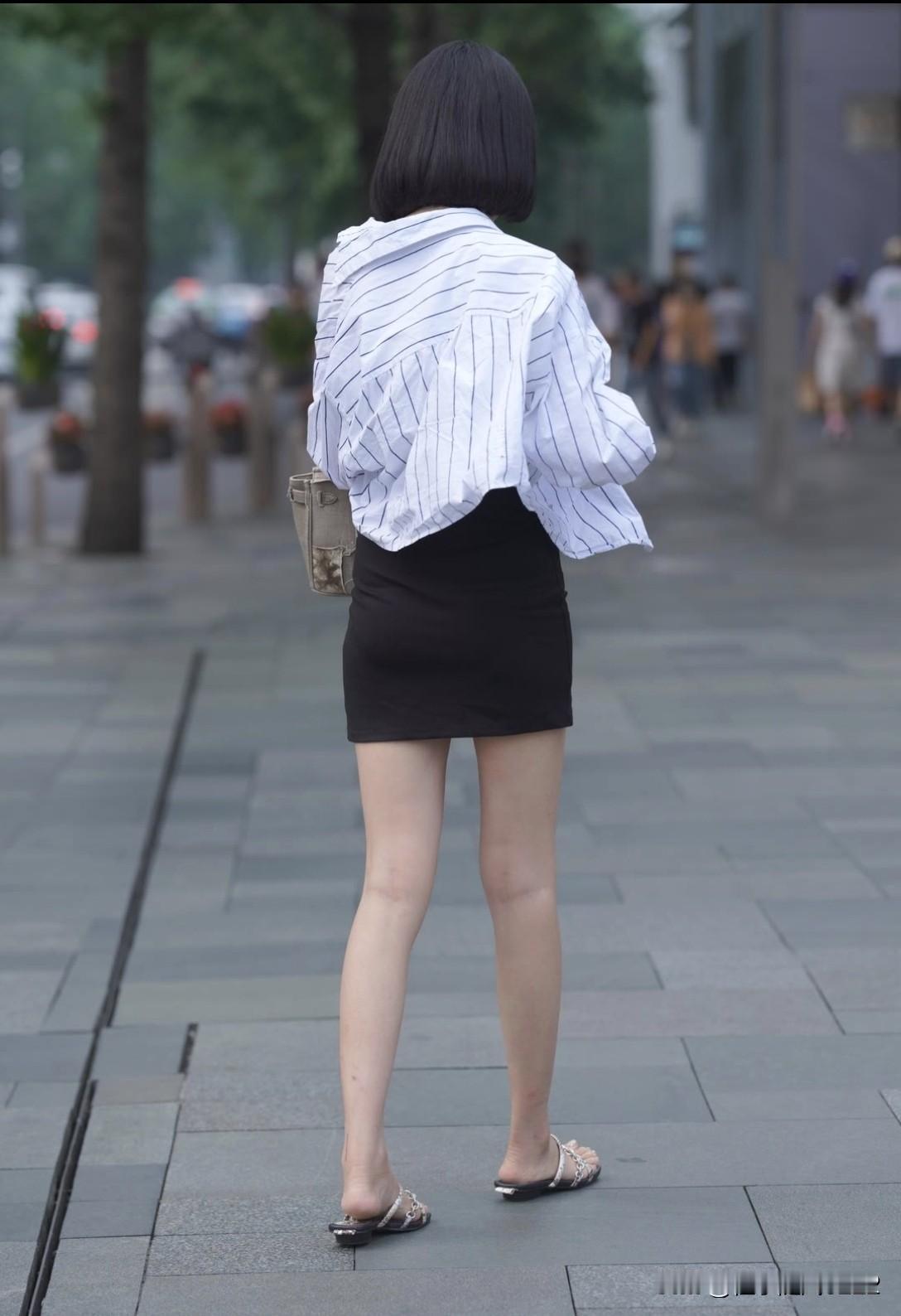 都市街头时尚穿搭,黑白条纹衬衫+黑色短裙,搭配简约手袋,优雅自信