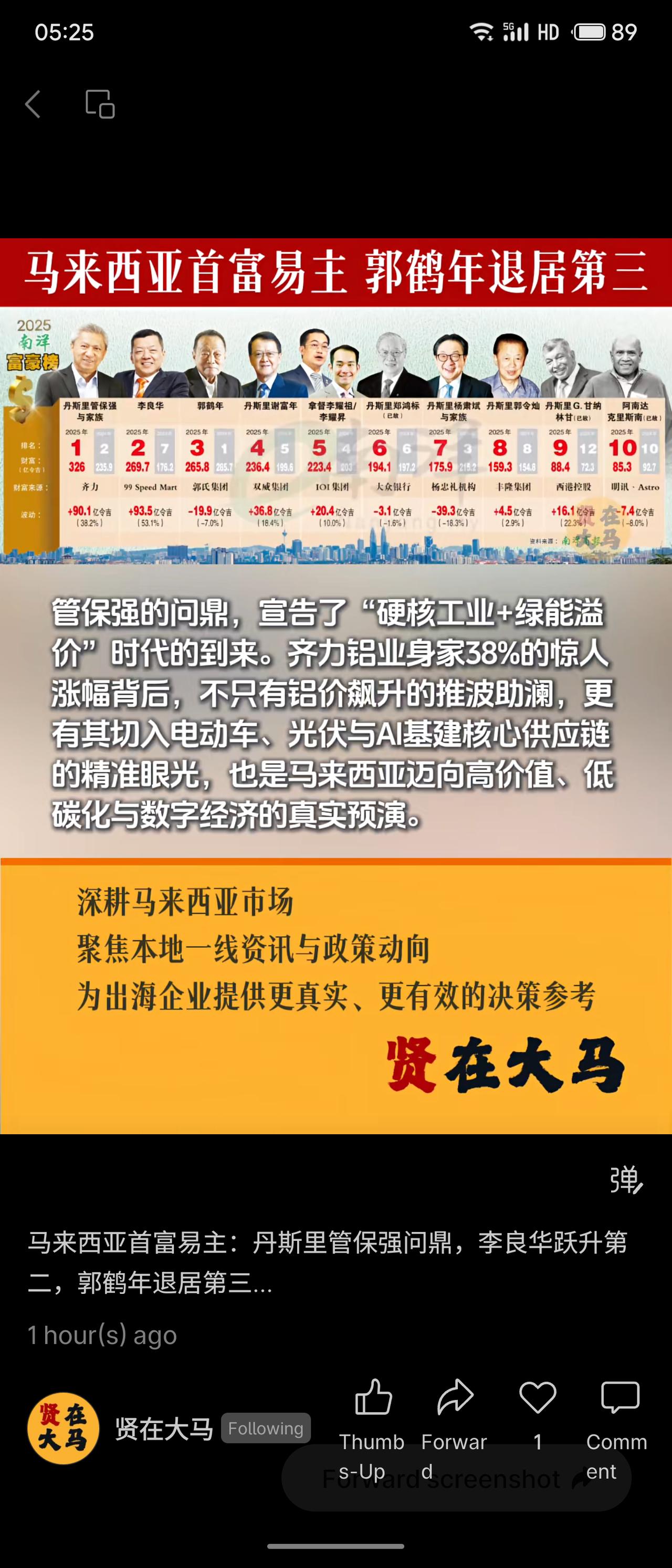 2025南洋富豪榜剧变,铝业大亨管保强以326亿令吉登顶马来西亚首富,99 Speed Mart创办人李良华跃居第二,“亚洲糖王”郭鹤年退居第三。管保强财富暴涨38%,得益于切入电动车、光伏等绿色产业链,标志着马来西亚“硬核工业+绿能溢价”新趋势。