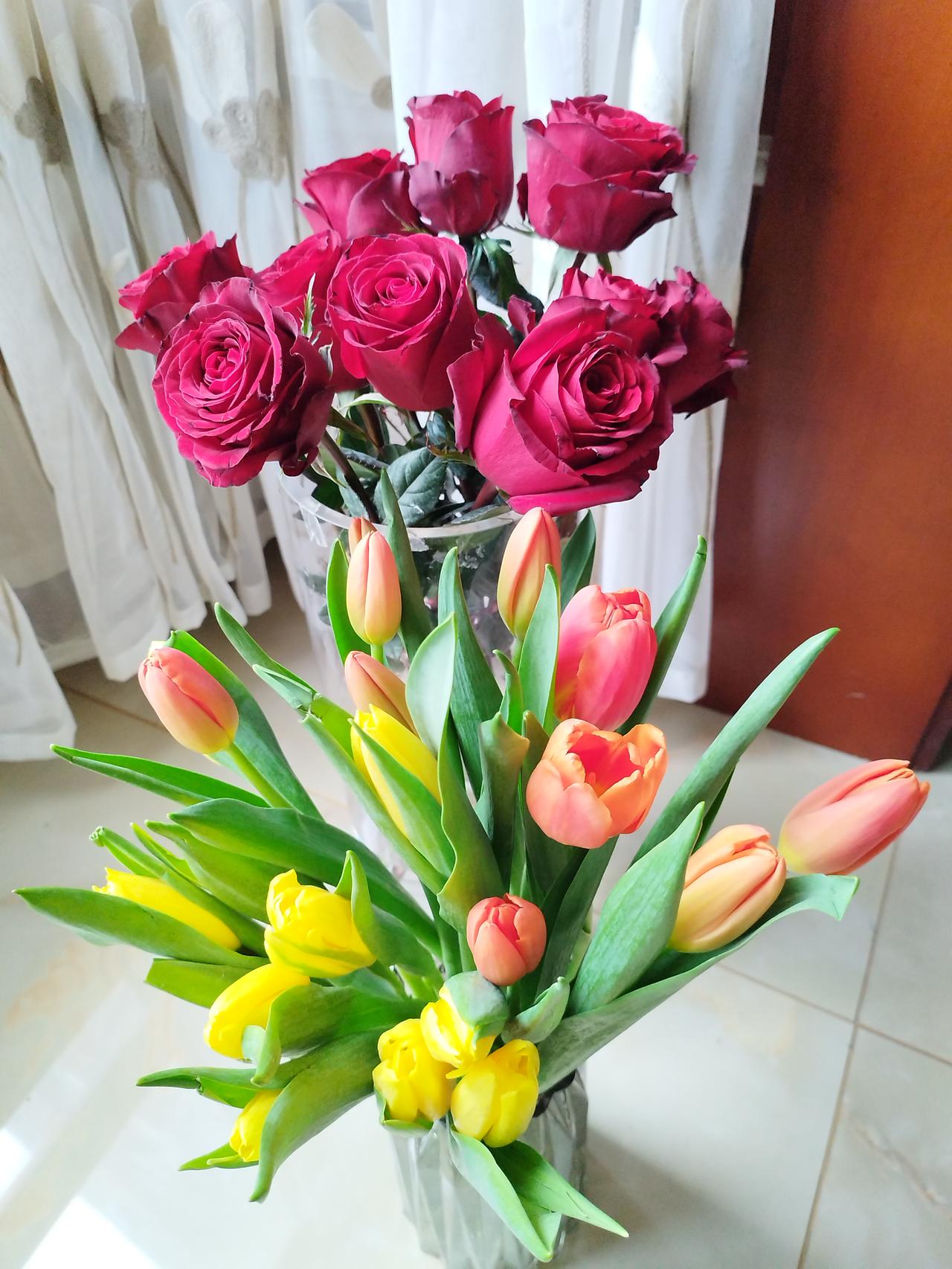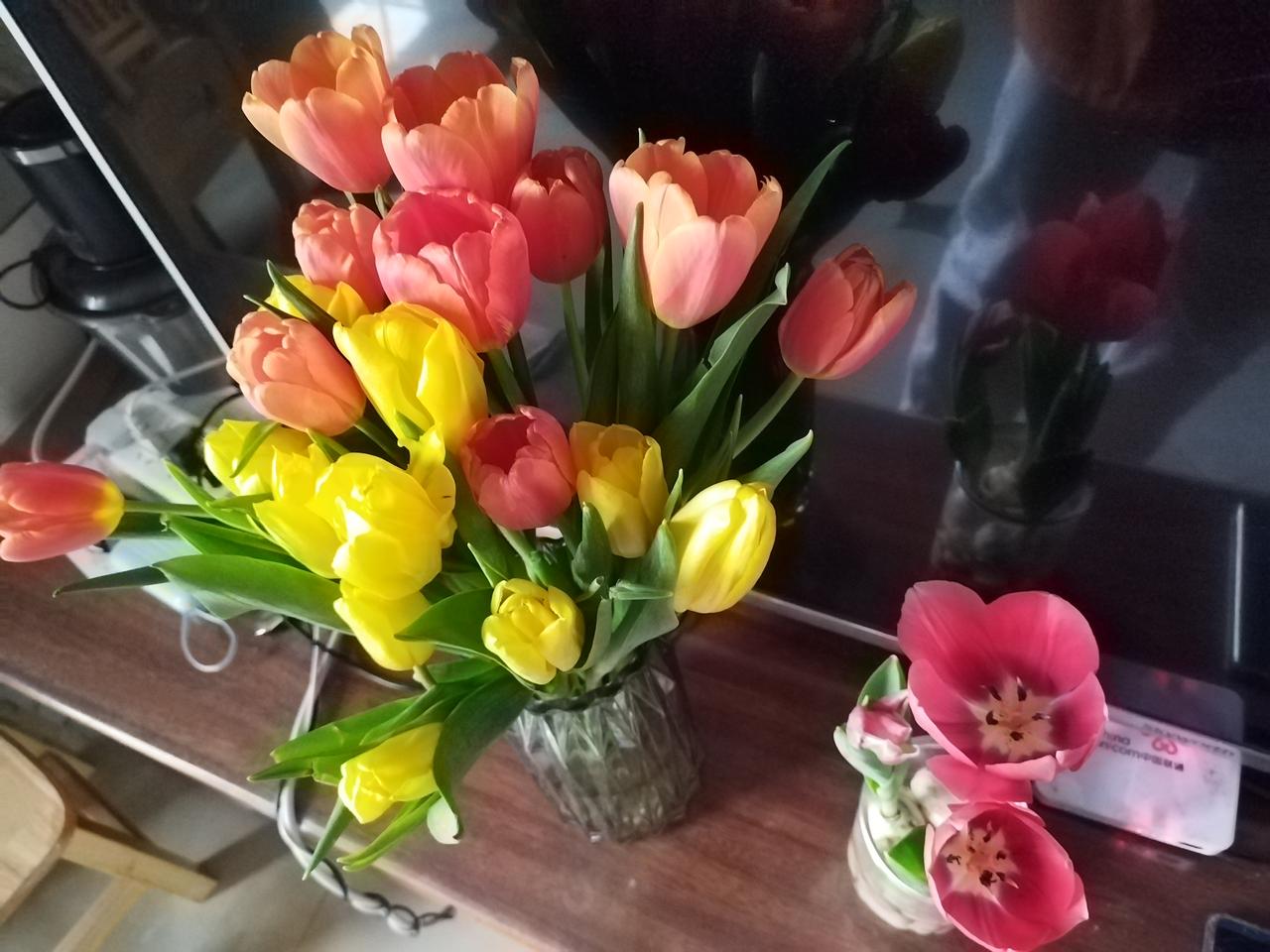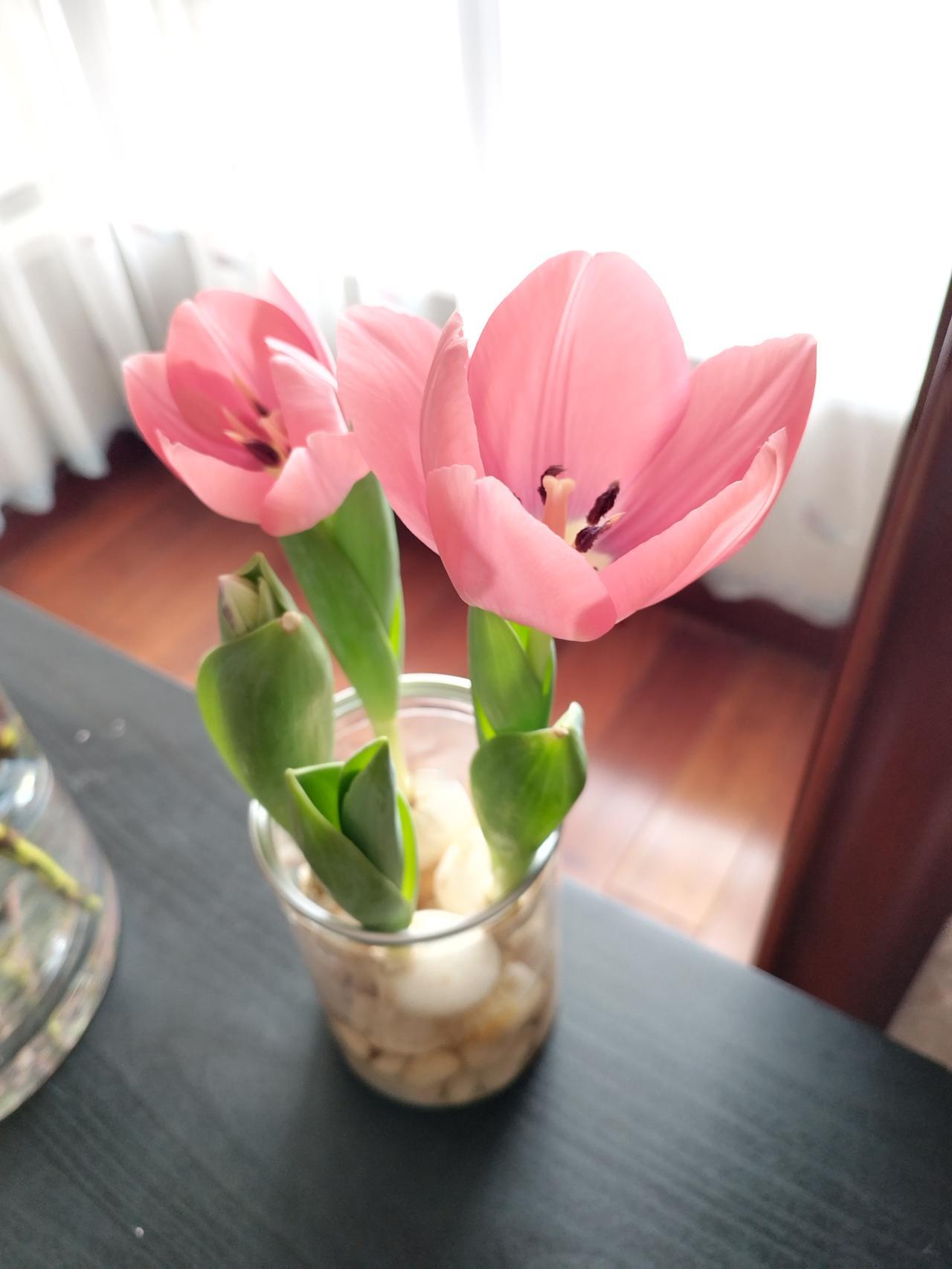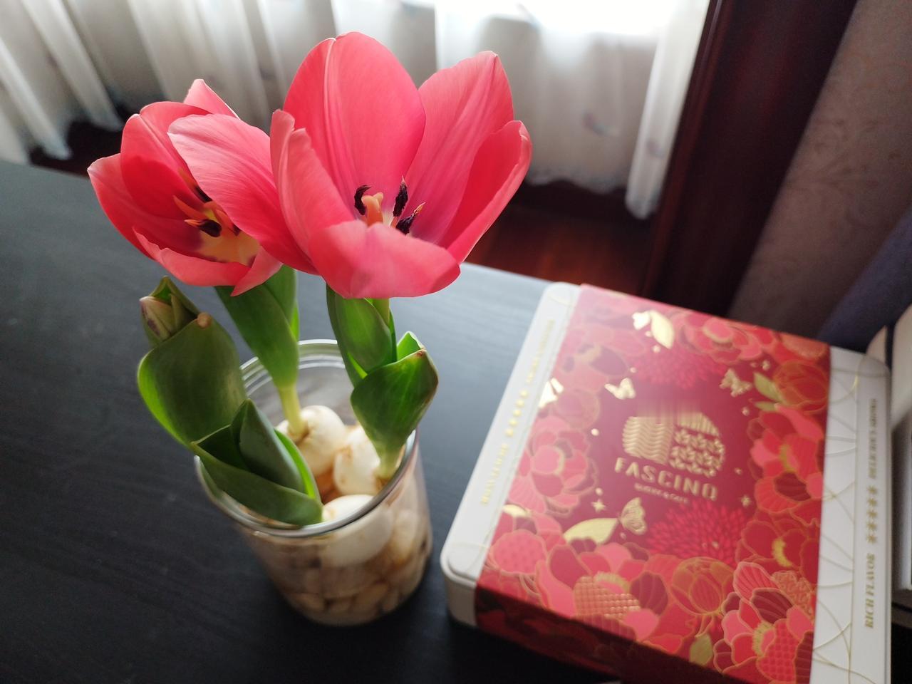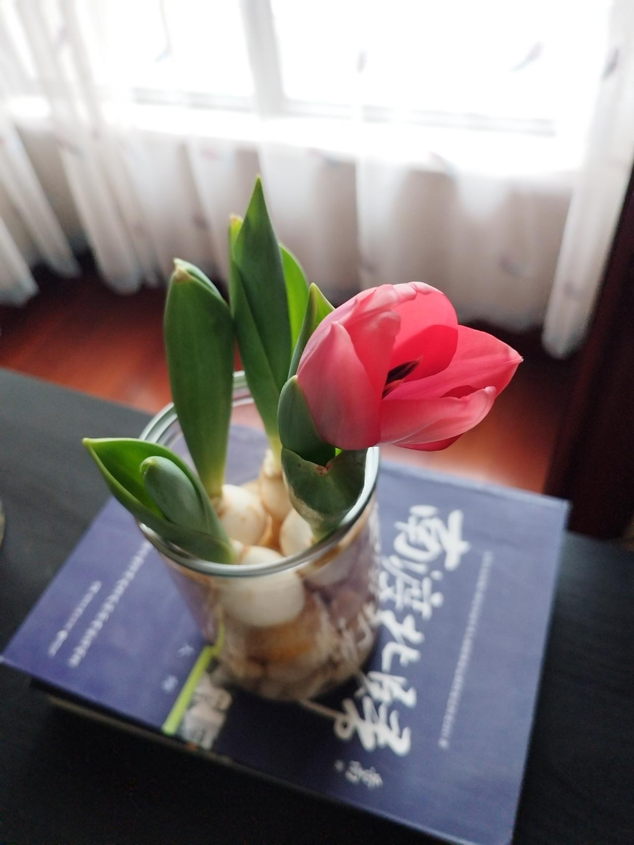 郁金香真的能自己养开花,我还以为上当了,差点被我扔掉。 我一月中旬在网上买了四个郁金香种球,买来就放小盒子里水培,但是它一直不长,过了好多天都没动静,而且种球上有的地方还发霉了,我以为店家骗人的,正在犹豫要不要扔掉的时候,发现它伸展出绿叶子了,然后长的越来越快,就在除夕那天它开出了第一朵花,大年初一又开了一朵,真是好兆头,四个种球花了十一块多,我在盒马买的两束郁金香花了70,一共二十支,自己种和店里买其实价格都差不多呢。