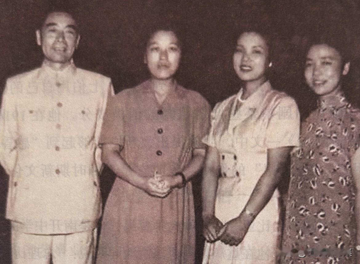 1955年10月1日,北京国庆招待会,周恩来总理与三位“喜儿”的合影,右起:田华是电影版喜儿、松山树子则是芭蕾舞版喜儿、王昆是歌剧版喜儿。在周总理的亲自邀请下,松山芭蕾舞团于1958年3月首次访华演出。他们的演出在北京等地引起了巨大轰动,甚至形成了歌剧、芭蕾舞、京剧三个版本的《白毛女》同城竞演的盛况。