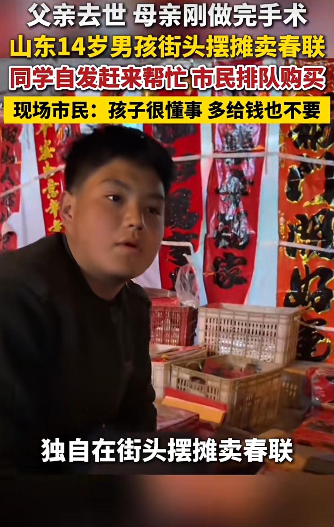 腊月的山东招远,寒风像刀子一样刮在脸上。在街头的一个角落,14岁的小高和他的龙凤胎姐姐,正守着一个春联摊。他们的父亲因癌症离世,母亲刚做完腰椎手术,无法再像往年一样出摊。看着家里备下的满满当当的年货,这个本该在父母怀里撒娇的少年,主动扛起了生活的重担。 起初,他只是一个人默默地守着摊位,从清晨到深夜,一天要站上十几个小时。直到有人把他的故事发到了网上,这座城市的善意,像潮水一样涌了过来。 同班的同学们来了,他们放下书包,帮着吆喝、整理货物,把小小的摊位变成了青春的阵地。“我们就是来帮他分担一下,他一个人太辛苦了。”一句简单的话,却比任何豪言壮语都更有力量。 更多的市民来了,他们排着队,只为买一副春联、一个福字。有人买了10元的东西,却悄悄塞下几百元;有人下了一万元的订单,只为用最体面的方式,帮这个少年一把。但小高和姐姐总是坚决地把多余的钱退回去,他们说:“我们卖东西,只收该收的钱。” 这一幕,让无数人破防。我们总说,成年人的世界没有容易二字,但这个14岁的少年,用他瘦弱的肩膀告诉我们:真正的成长,从学会担当开始。 他没有抱怨命运的不公,也没有乞求别人的怜悯,而是选择用自己的双手,去撑起一个家。而这座城市,也用最温柔的方式回应了他的坚强不打扰、不施舍,只是用一场无声的排队,守护着少年的尊严。 这才是最动人的正能量:一个少年在寒风中挺起脊梁,一座城用爱为他挡风遮雨。14岁男孩