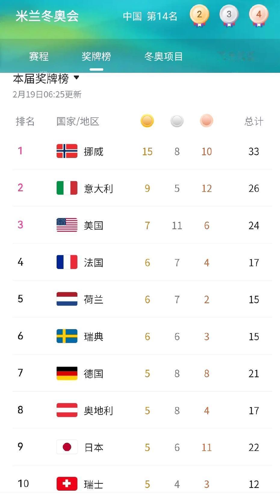 大年初三清晨,米兰冬奥结束第12个比赛日,总共产生了10枚金牌,为开赛以来单日之最。挪威在越野滑雪男子团队自由式冲刺夺冠,以15金8银10铜在奖牌榜继续扩大领先优势,其金牌总数逼近历史最佳的16金,意大利和美国稳居第二和第三,其它9枚金牌分布如下。 ▷加拿大2枚(速度滑冰女子团体追逐和短道速滑男子500米) ▷中国2枚(男子坡面障碍技巧和自由式滑雪女子空中技巧) ▷美国1枚(高山滑雪女子回转) ▷法国1枚(冬季两项女子4×6公里接力) ▷日本1枚(女子坡面障碍技巧) ▷瑞典1枚(越野滑雪女子团队自由式冲刺) ▷韩国1枚(短道速滑女子3000米接力) 日本今天增加1金后,以5金6银11铜超越瑞士,上升到奖牌榜第9,锁定亚洲第一,其金牌总数逼平本队历史最佳,奖牌总数继续刷新自己的历史记录,中国获得2金后,排名超越韩国位列奖牌榜第14。