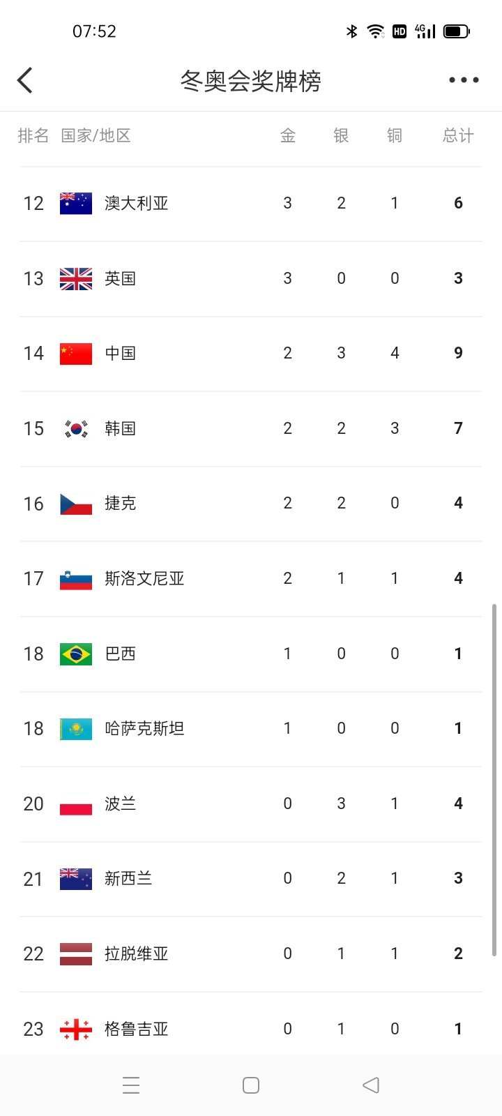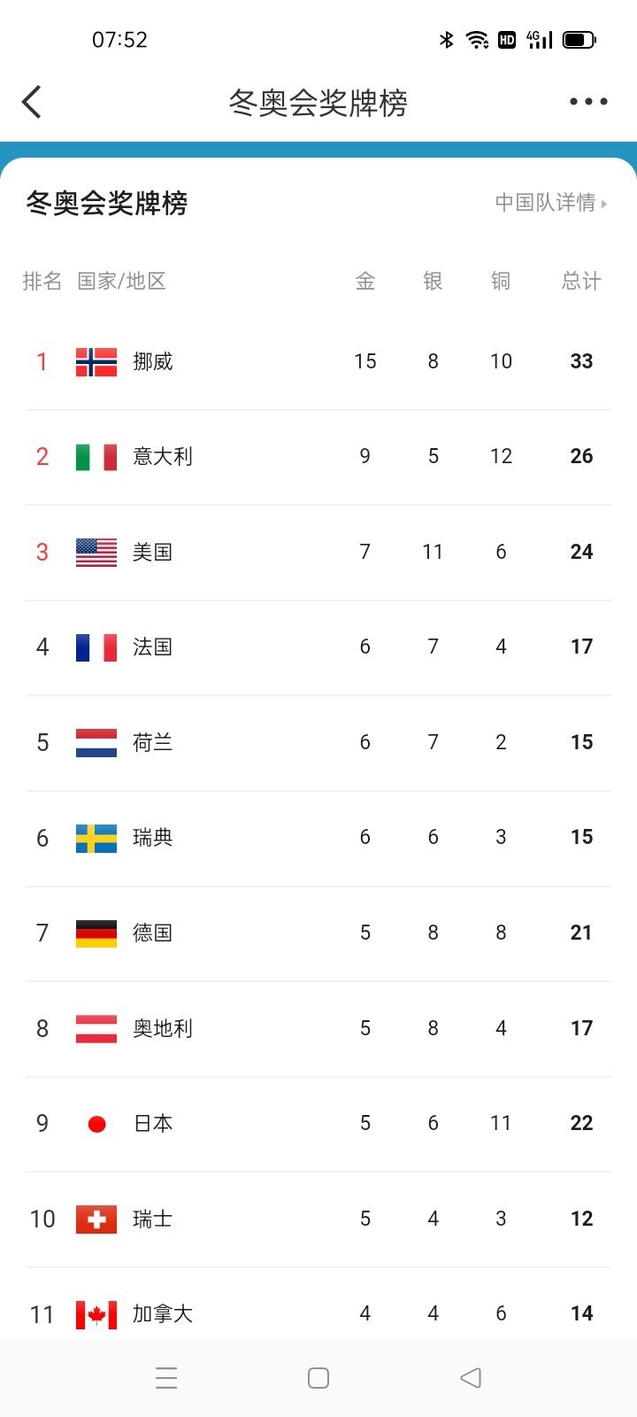 米兰冬奥会本届冬奥会已经进行到第14天,中国队才获得首金。目前奖牌榜是:如下图
