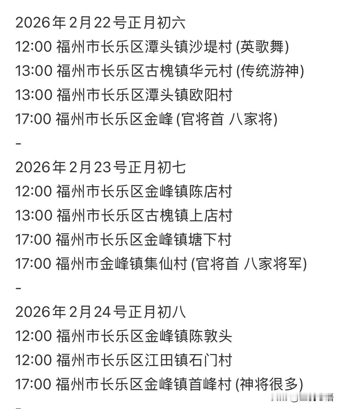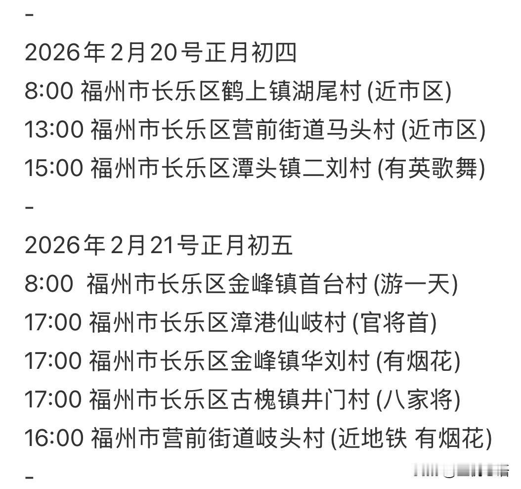 2026福州游神攻略来啦!这可是福建春节最热闹的民俗,年味直接拉满,一定要去感受下! 去看游神的朋友记好,一定要戴好帽子、口罩和护目镜,现场一路放鞭炮,做好防护准没错。 初四到初八长乐区的游神场次超多, 各个村各有特色,挑着去就行。 初四二刘村有英歌舞, 初五仙岐村看官将首、华刘村有烟花, 初六沙堤村还能再看英歌舞,超有看头。 离市区近的湖尾村、马头村, 还有近地铁的岐头村, 出行都很方便,不想跑远的可以选这些。 福州游神这氛围真的独一份,锣鼓喧天超热闹,满满的人间烟火气。 在福州过年的朋友,别宅家了,赶紧挑个场次去凑凑热闹,沾沾新年的喜气! 具体时间表图里有。