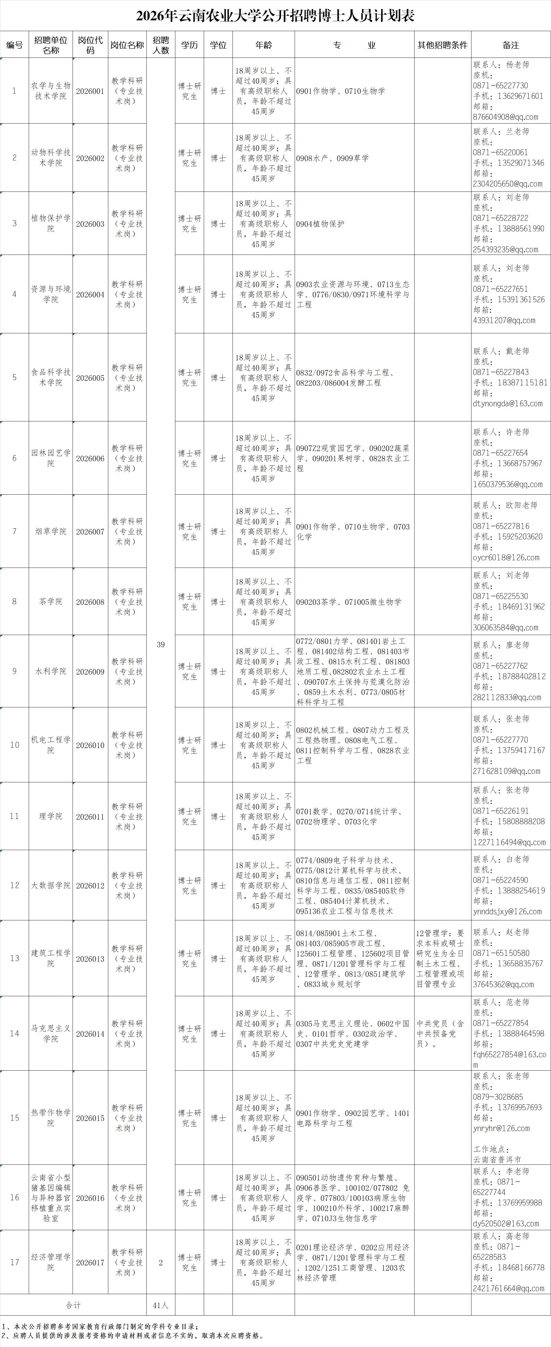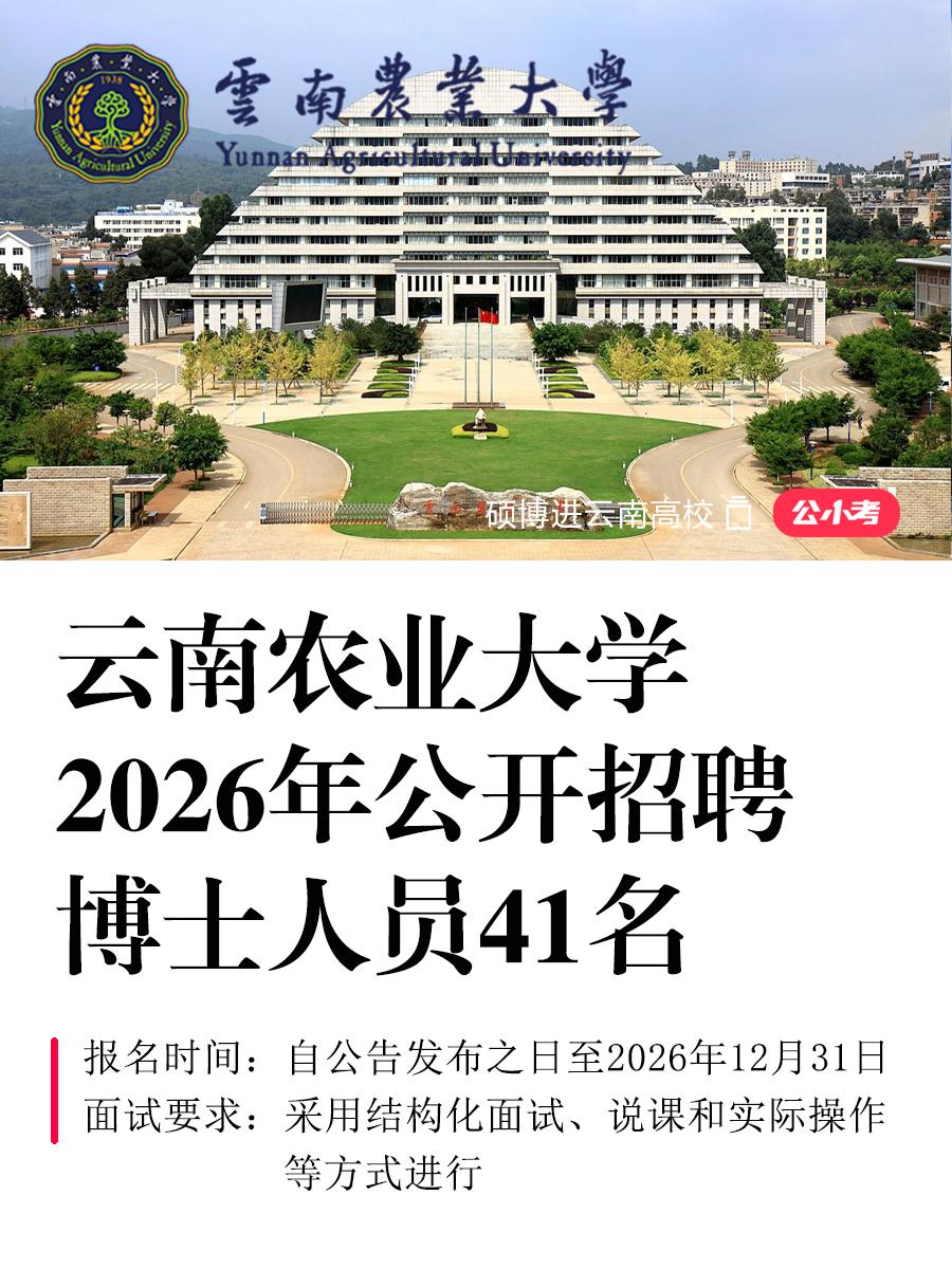 云南农业大学2026年招聘博士人员41名。按照《事业单位公开招聘人员暂行规定》(人事部令第6号)、《云南省事业单位公开招聘工作人员办法》(云人社发〔2016〕182号)等法律法规,根据工作需要,经云南省教育厅审核同意报云南省人力资源和社会保障厅核准,2026年云南农业大学计划面向社会公开招聘博士人员41名,现将有关事项公告如下: