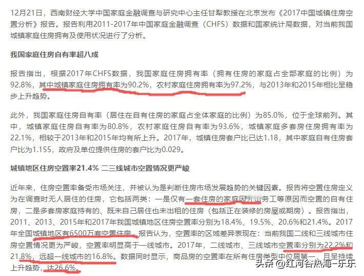 2017年的时候,当时西南财经大学就出过一个调查报告。 当时说是一线城市的住房空置率为 16.8%, 二线城市的住房空置率为22.2%, 三线城市的住房空置率为21.81%。 后来经过这么多年的发展,又盖了那么多的房子,现在的空置率是多少?
