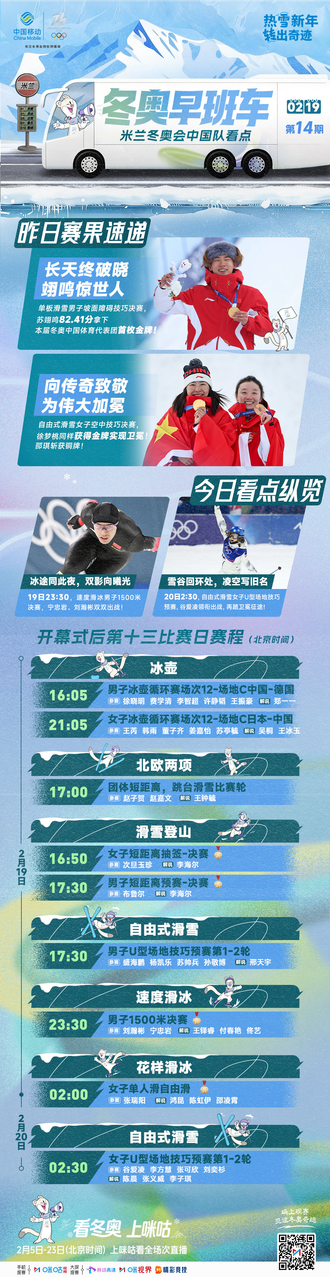 🚌冬奥早班车2月19日第14期🥇苏翊鸣摘首金徐梦桃卫冕成功⏰23:30宁忠岩出战速滑男子1500⏰02:30谷爱凌出战女子U型池#看冬奥上咪咕##热雪新年翊起转#网页链接