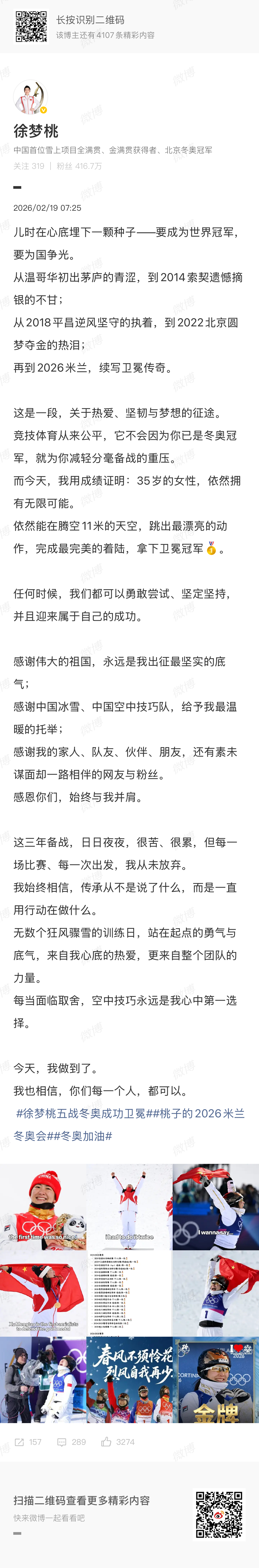 从温哥华初出茅庐的青涩,到2014索契遗憾摘银的不甘;从2018平昌逆风坚守的执着,到2022北京圆梦夺金的热泪;再到2026米兰,续写卫冕传奇。这是一段,关于热爱、坚韧与梦想的征途。竞技体育从来公平,它不会因为你已是冬奥冠军,就为你减轻分毫备战的重压。而今天,我用成绩证明:35岁的女性,依然拥有无限可能。依然能在腾空11米的天空,跳出最漂亮的动作,完成最完美的着陆,拿下卫冕冠军🥇。任何时候,我们都可以勇敢尝试、坚定坚持,并且迎来属于自己的成功。感谢伟大的祖国,永远是我出征最坚实的底气;感谢中国冰雪、中国空中技巧队,给予我最温暖的托举;感谢我的家人、队友、伙伴、朋友,还有素未谋面却一路相伴的网友与粉丝。感恩你们,始终与我并肩。这三年备战,日日夜夜,很苦、很累,但每一场比赛、每一次出发,我从未放弃。我始终相信,传承从不是说了什么,而是一直用行动在做什么。无数个狂风骤雪的训练日,站在起点的勇气与底气,来自我心底的热爱,更来自整个团队的力量。每当面临取舍,空中技巧永远是我心中第一选择。今天,我做到了。我也相信,你们每一个人,都可以。”