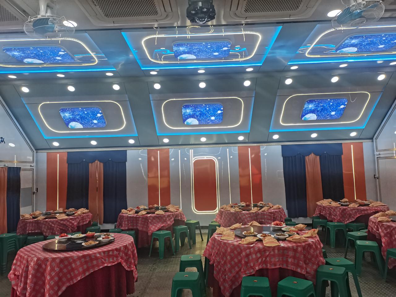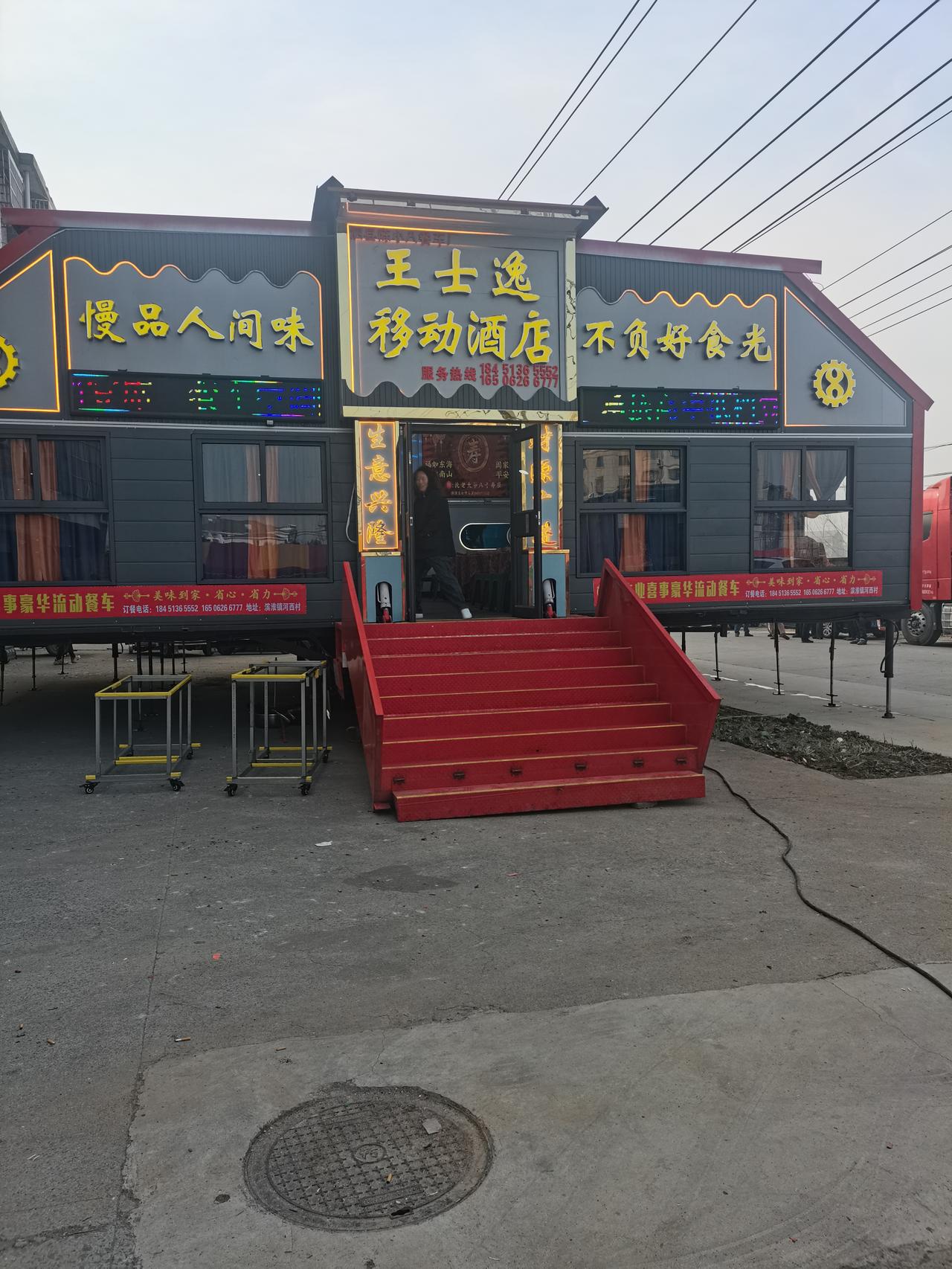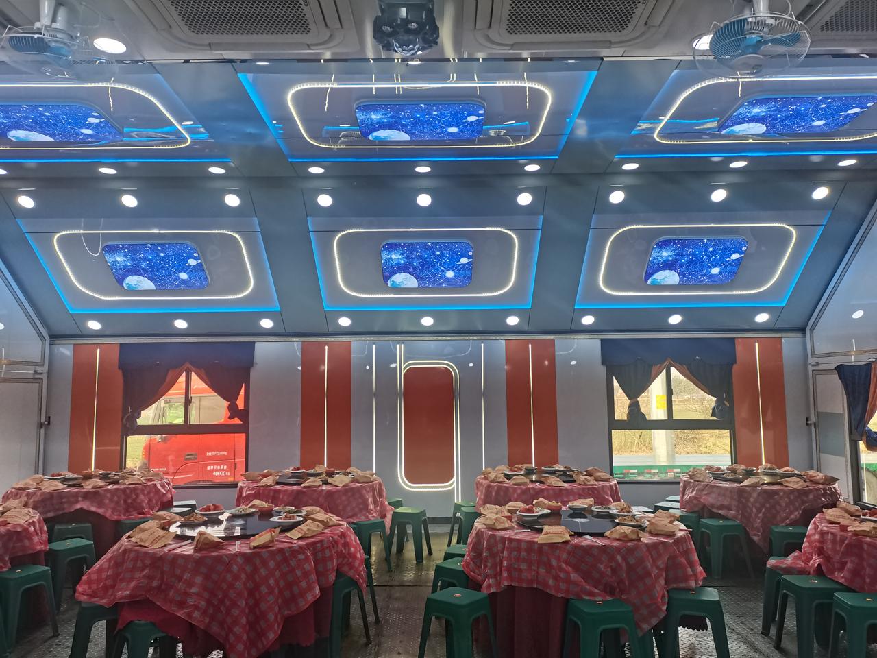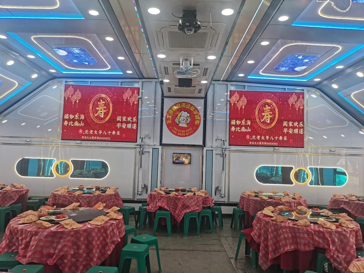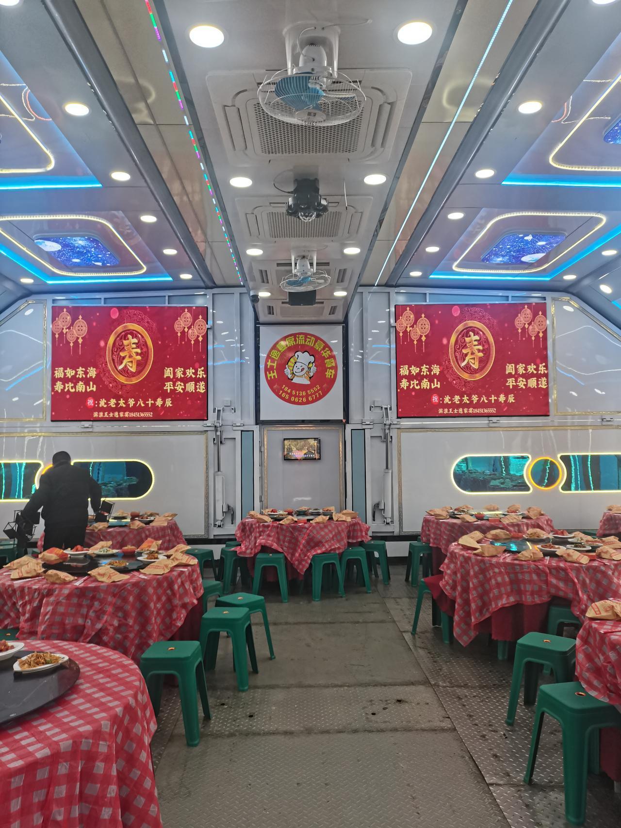 一台车到底有多大的用处! 外表看起来就是一台普通的9.6米货柜车,你会相信一台车可以容纳这么多的桌子吗! 回到农村真的也可以大开眼界,一台货柜车的内有乾坤也是让人增长了见识。 流动餐车服务也是非常专业的,昨天晚上流动餐车已经到位,打开后今天一早就开始摆桌子,烧菜在另外一台餐车上,另外一台车类似于厨房,洗菜、切菜、炒菜,全套服务行云流水,希望今天可以吃到热呼呼的饭菜。 祝我家公公身体健康,万寿无疆。