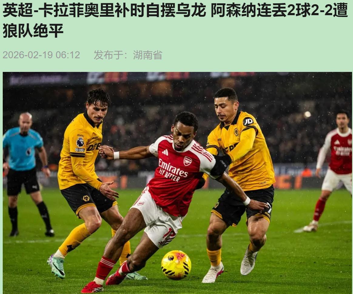 看阿森纳最折磨人的是什么?是你刚掏出手机想吹两句"稳了",抬头就看见自家后卫把球拱进自家大门。 凌晨4:00这出戏,教科书级别的"枪手式心梗"。萨卡那头球一砸,15场球荒破了,你寻思能睡个踏实觉;因卡皮耶单刀再下一城,2-0,茶几上的啤酒都备好了。结果呢?最后20分钟,防线松得跟你加班时的注意力一样,乌戈-布埃诺那一脚世界波,直接把梦轰碎。 更诛心的是第94分钟。拉亚出击那下,我隔着屏幕都想喊"别啊",他偏要摘空气。球砸柱反弹,卡拉菲奥里愣在原地——那表情我太熟了,就跟忘带钥匙还撞上领导一个德行。煮熟的鸭子,飞了。 运气背?拉倒吧,这赛季多少回领先翻车了?萨卡一伤退,前场立马便秘;塔子哥换人跟自废武功似的。多赛领先曼城5分?这2分一丢,下一轮德比腿不软才怪。 狼队那韧劲,真让人服气。被摁着打了70分钟,硬是靠一口气咬回来。这大概就是英超的魅力——没有谁是来陪跑的。阿森纳要做冠军,得先学会当恶霸,而不是当背景板。年轻人,学费交够了,该长大了。英超-卡拉菲奥里补时自摆乌龙 阿森纳连丢2球2-2遭狼队绝平
