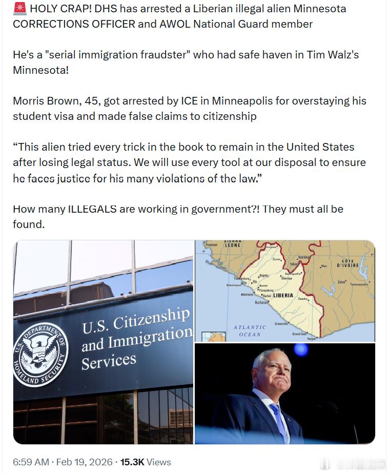 美国土安全部逮捕了一名利比里亚非法移民,他是明尼苏达州的一名监狱矫正官,同时还是一名擅离职守的国民警卫队成员。