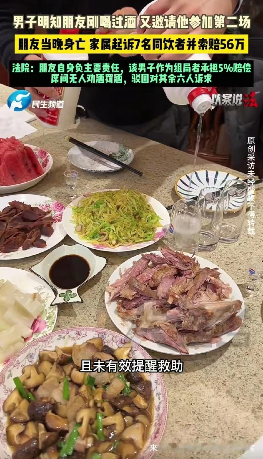 广西,男子参加完第一次酒局后,已经晕头转向,可朋友又叫他再出去喝两杯,男子抹不开面子,硬撑着前往。第二场酒局结束后,男子彻底不省人事,朋友将他搀扶着送回家,然后离开。谁知半夜,男子因酒精中毒昏迷,妻子紧急将他送医,但人还是不幸去世。男子一家天塌了,将同饮的7人告上法庭,法院的判决亮了。 男子刘某性格外向,平日里就爱和朋友小聚喝两杯。 事发当天,他先是参加了一场酒局,几个人边吃边聊,不知不觉就喝多了,散场时脚步虚浮,还是朋友把他搀扶着送回了家。 刘某瘫在沙发上刚眯了没多久,手机响了,是曾某打来的,说晚上组了个局,喊他过去凑凑热闹。 刘某脑子昏沉沉的,他已经喝不少了,但又抹不开面子,加上酒精上脑,跟妻子打了声招呼就又出门了。 到了第二场酒局,桌上又是几瓶白酒和啤酒,大家边喝边玩,你一杯我一杯喝得也算自在。 一直到酒局散场,刘某已经彻底意识模糊了,走路都得靠人架着,一起喝酒的几个人轮流把他送回了家,交给了他妻子才各自离开。 可谁也没想到,就在这天晚上,刘某的妻子半夜醒来,发现丈夫呼吸不对劲,赶紧拨打120急救电话。 不幸的是,送到医院时他已经没了生命体征,法医鉴定为酒精中毒身亡。 突如其来的噩耗让全家人崩溃了,妻子和年迈的父母怎么也接受不了。 他们觉得儿子的死和一起喝酒的人脱不了干系,一怒之下,把曾某在内的7名同饮者都告上了法庭,索赔56万余元。 法院经过调查明确,第一场酒局的几个人在刘某酒后将他安全送到家,已经尽到了基本的注意义务。 第二场酒局里,除了曾某之外的其他人,也没有主动劝酒、罚酒的行为,在刘某喝醉后一起将他送回了家,也履行了应尽的责任。 《民法典》第1165条规定:行为人因过错侵害他人民事权益造成损害的,应当承担侵权责任。 刘某作为完全民事行为能力人,明知自身酒量仍连续两场过量饮酒,对酒精中毒死亡后果具有主要过错,应自行承担主要责任。 但曾某在打电话邀约的时候,明明知道刘某刚喝了一场酒,却还是喊他继续去喝。 而且在第二场酒局中,看着刘某越喝越多,他也没有及时提醒,直到刘某彻底醉倒才被动跟着一起送回家,没有对刘某的身体状况进行有效的关注和救助。 所以,曾某的行为存在过错。 综上,法院判决曾某存在过错,承担5%的赔偿责任,赔偿家属近3万元,驳回家属对其余六人的诉讼请求。 这起悲剧不仅让一个家庭失去了顶梁柱,也让几个原本关系不错的朋友反目成仇。 过年喝酒图的是热闹开心,可不是拼酒量,再好的朋友,也别硬劝、别硬喝,更别喝了一场又赶一场。 刘某的悲剧就是教训,本来喜庆的日子,一下子家破人亡,实在太痛心。 春节期间大家一定要量力而行,小酌怡情,大饮伤身,平安健康才是最大的福气,别让喜事变成悲剧。
